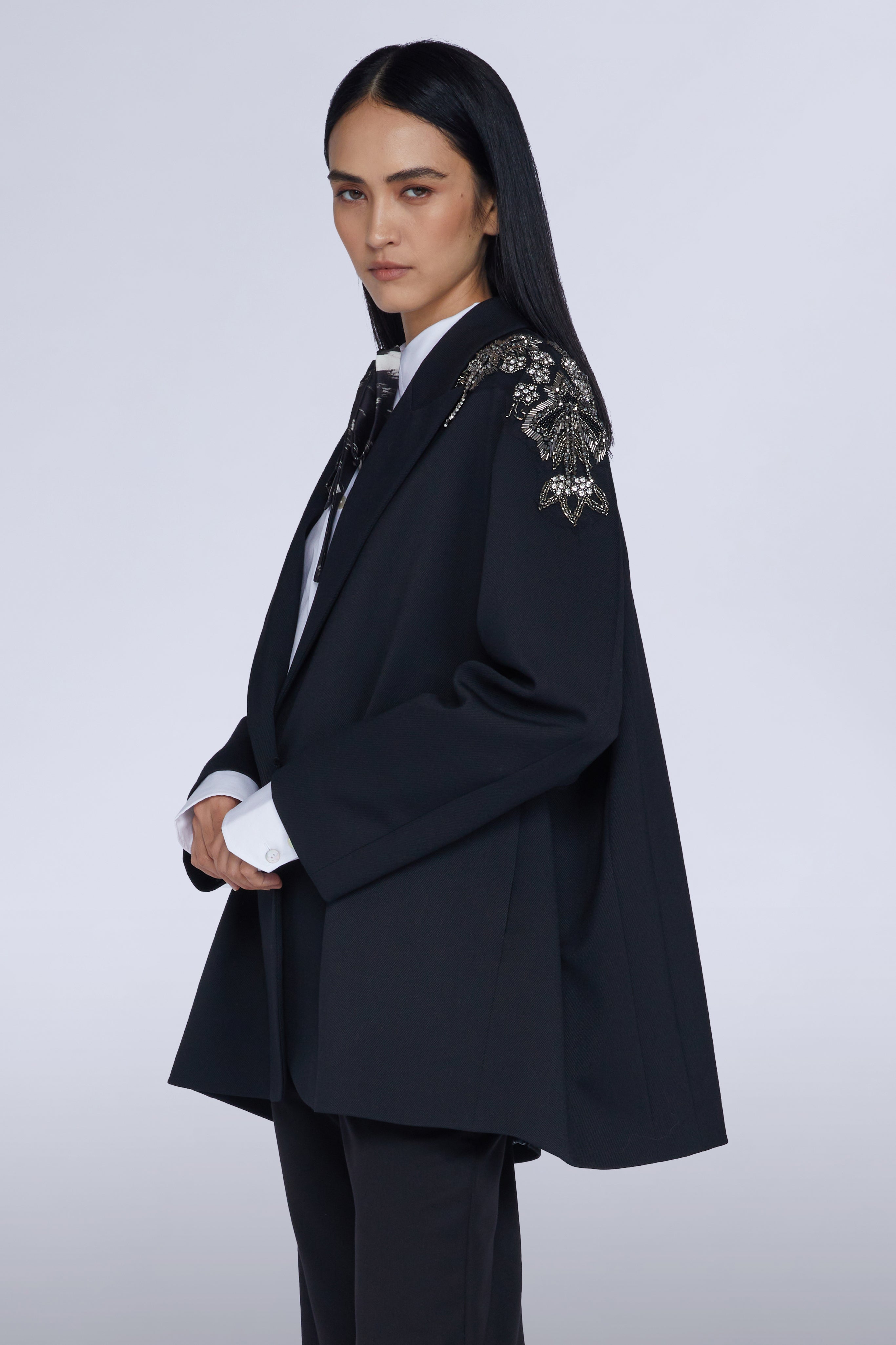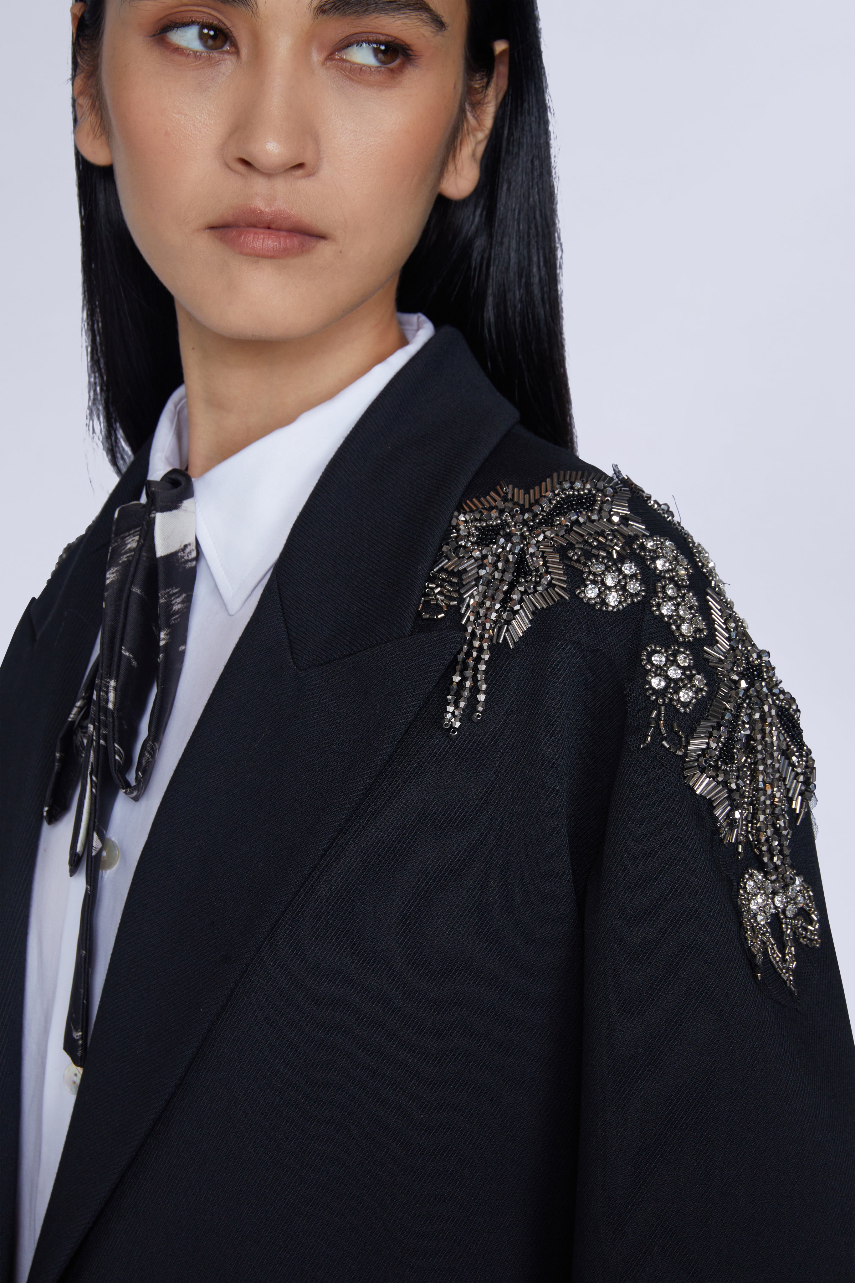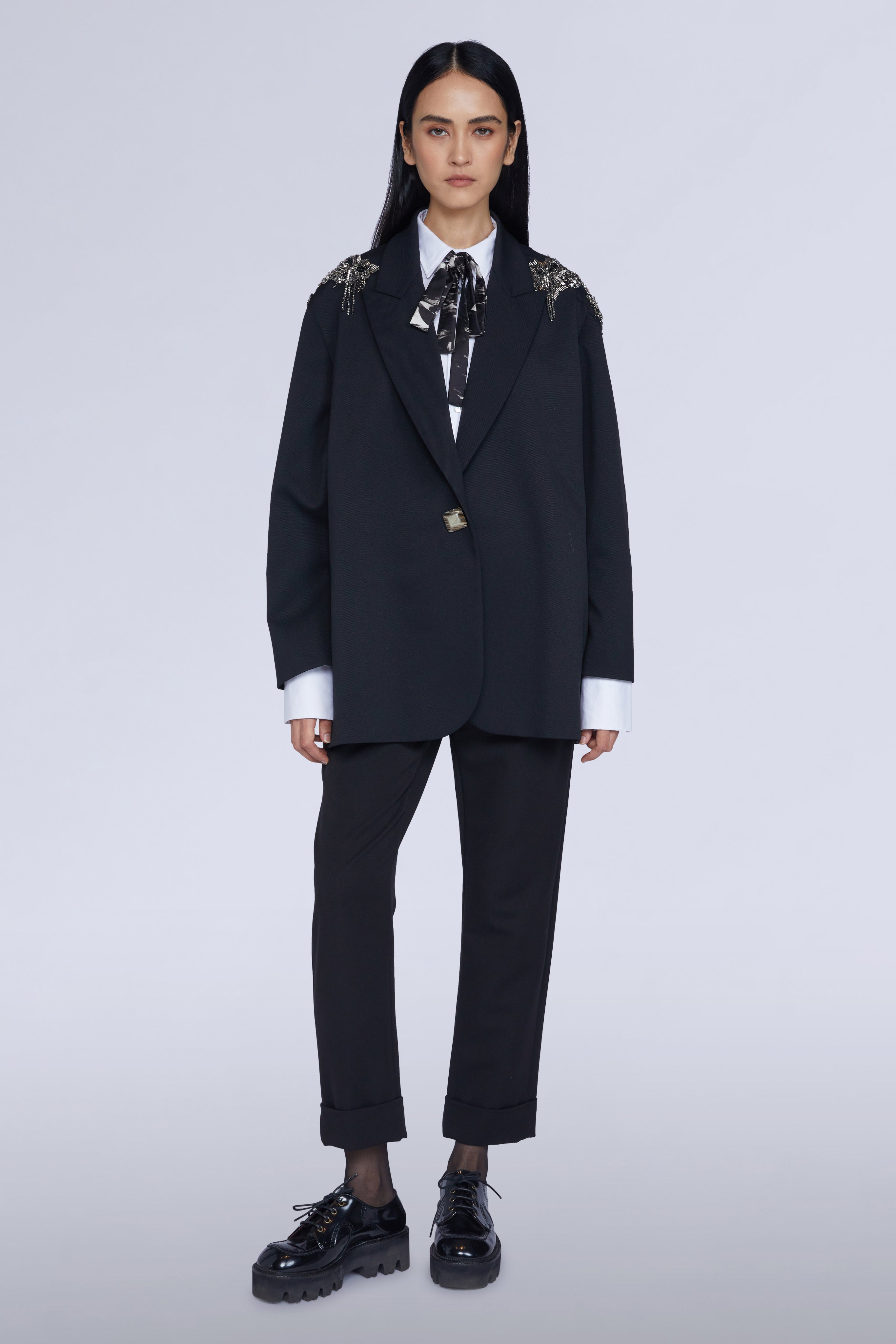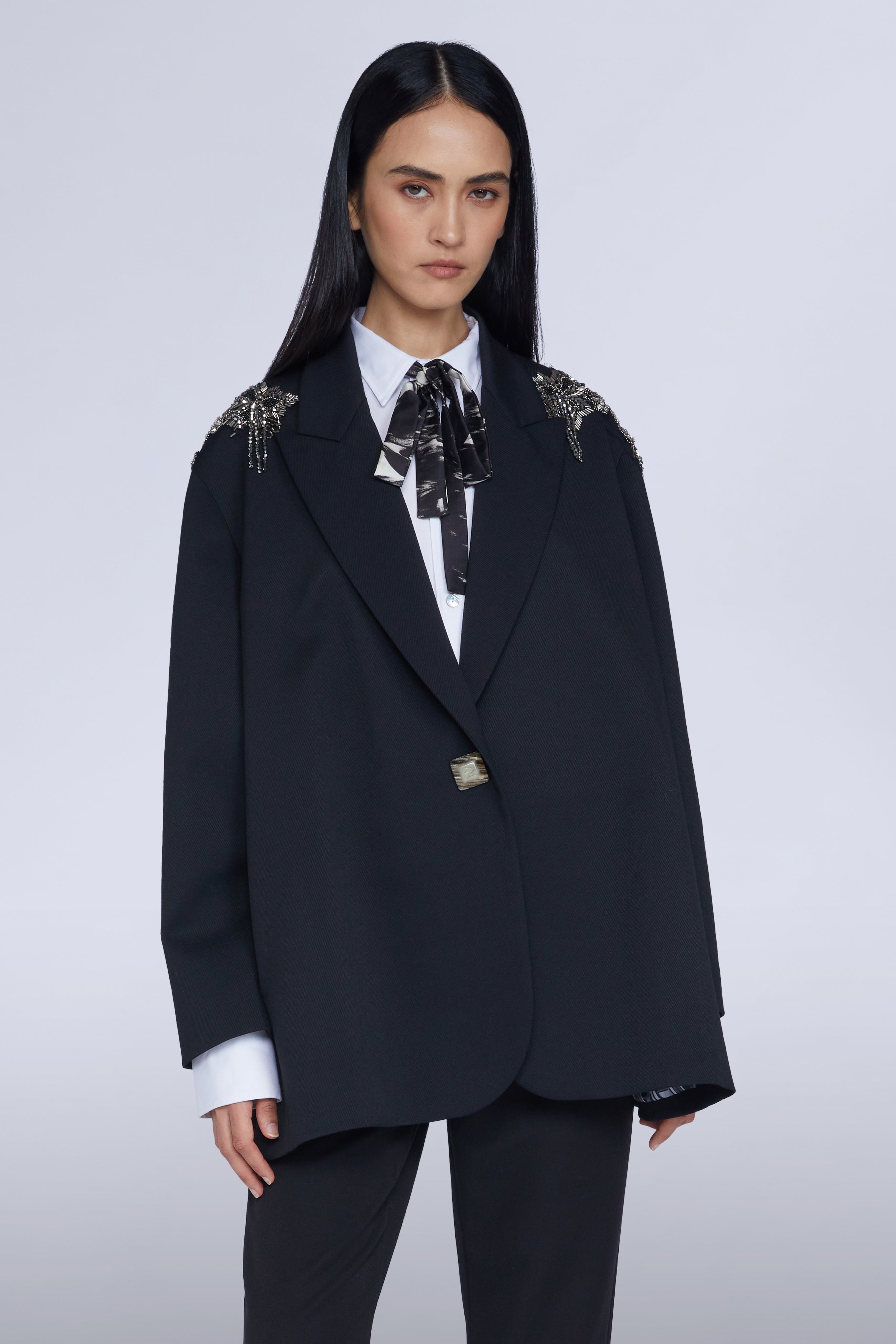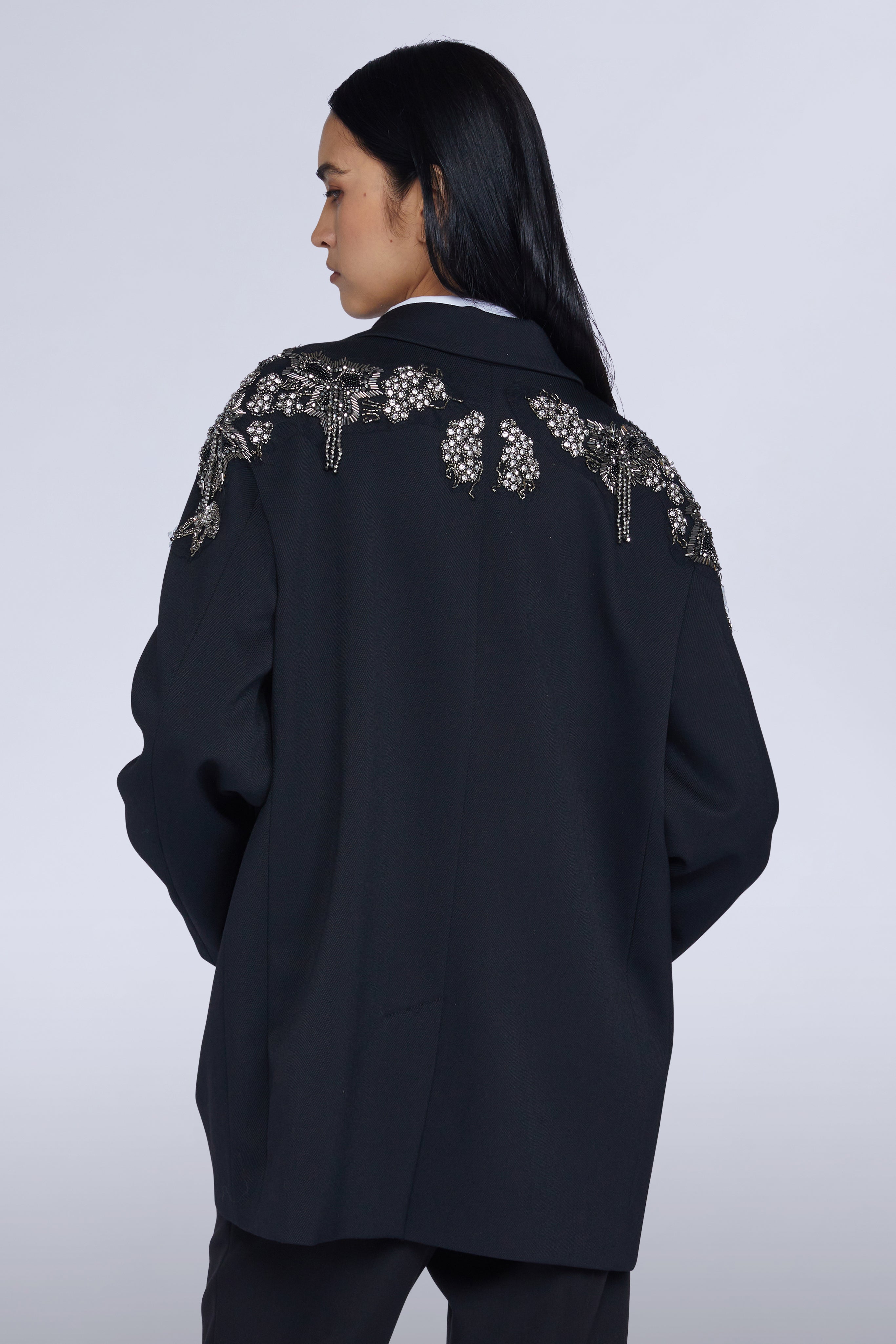 Featuring an oversized fit and a relaxed straight silhouette, the Antine I jacket is an eye-catching piece with symmetrically distributed shimmering rhinestone embroidery on the back and shoulder. This luxurious jacket is sure to take any outfit to the next level.