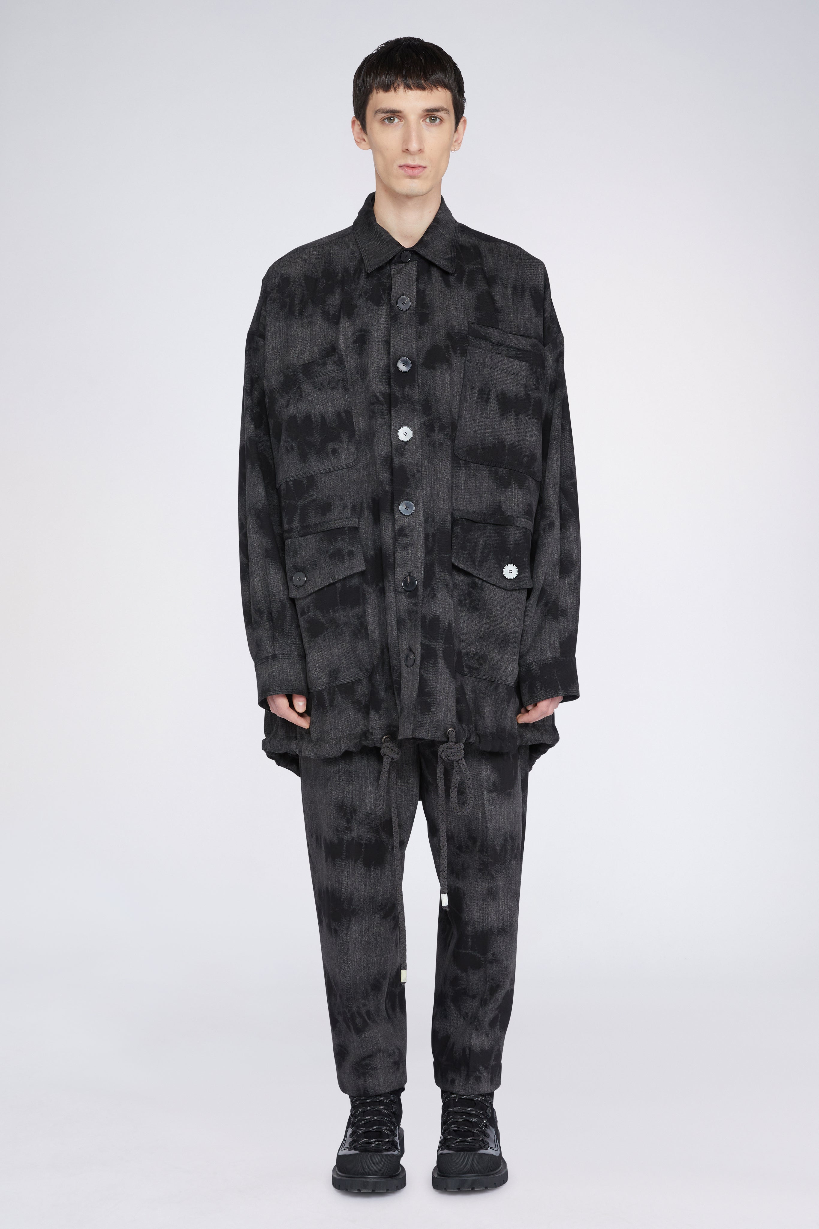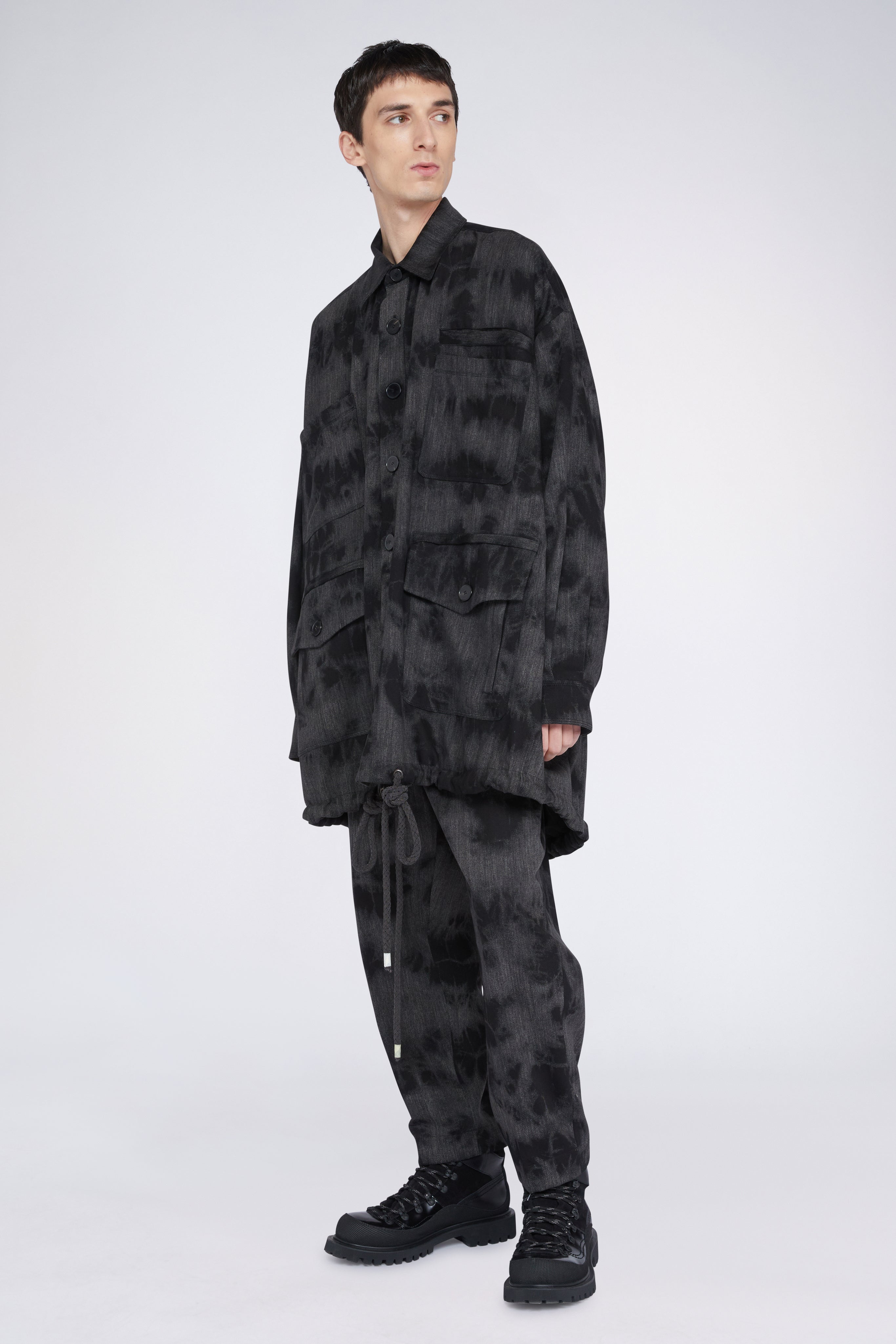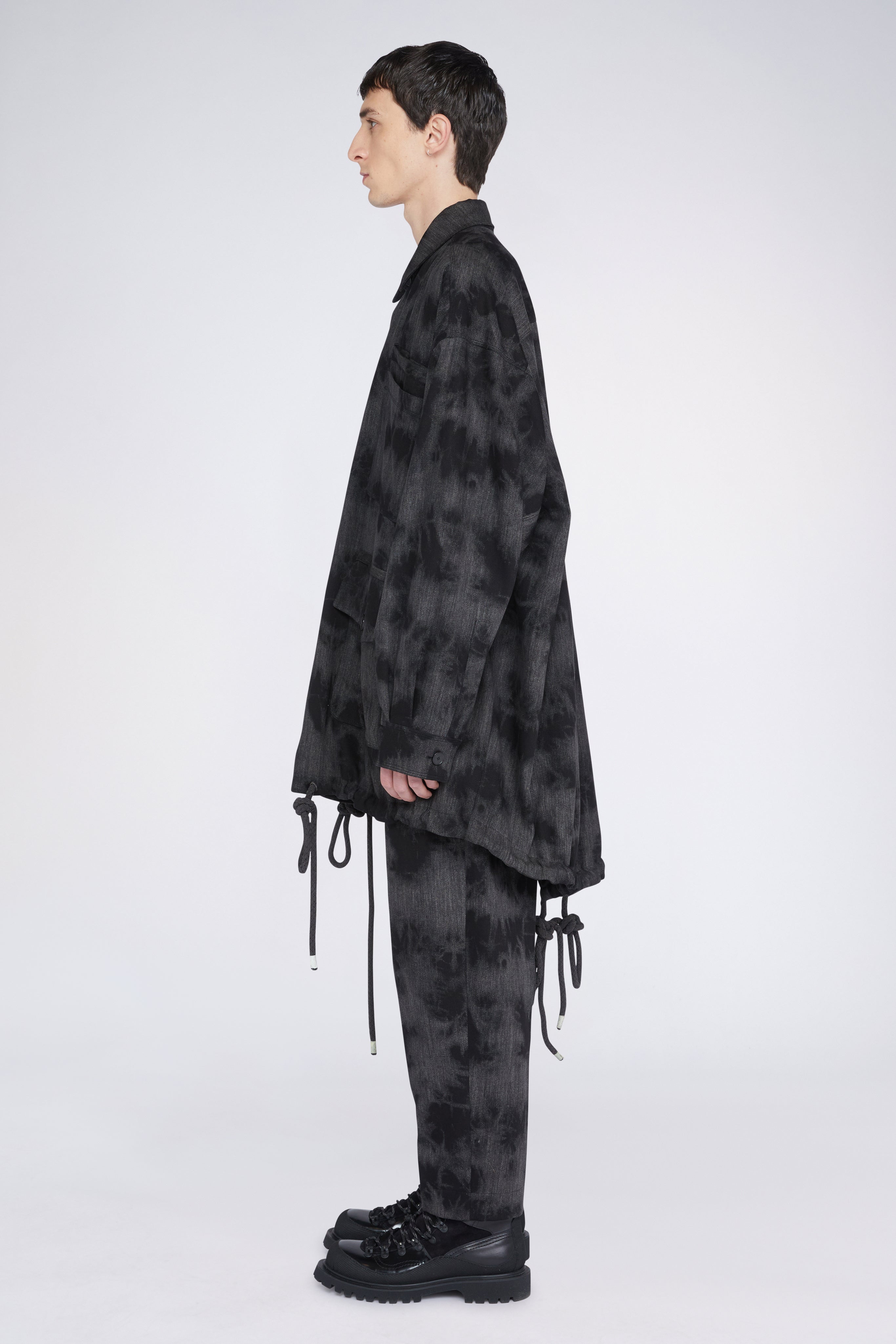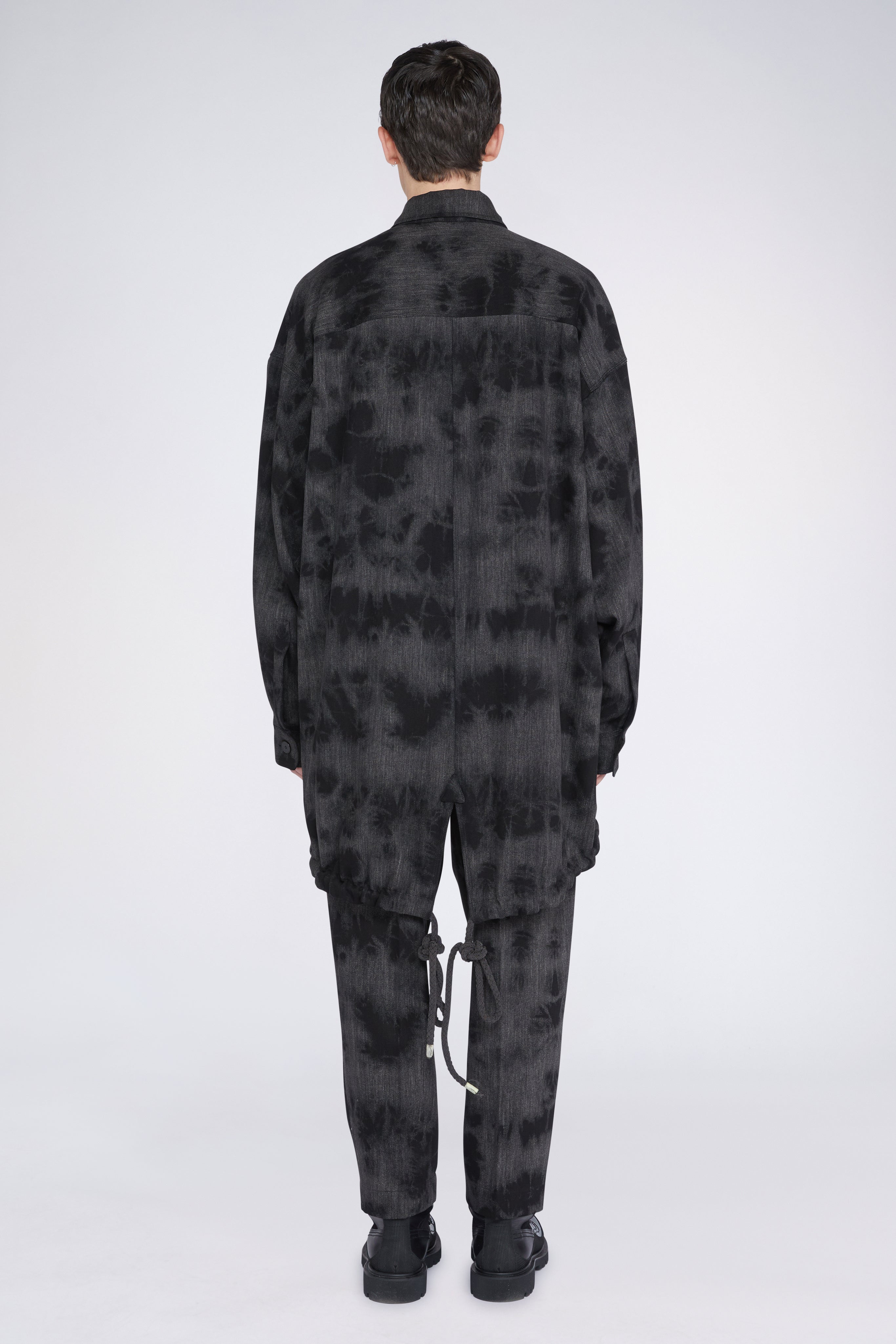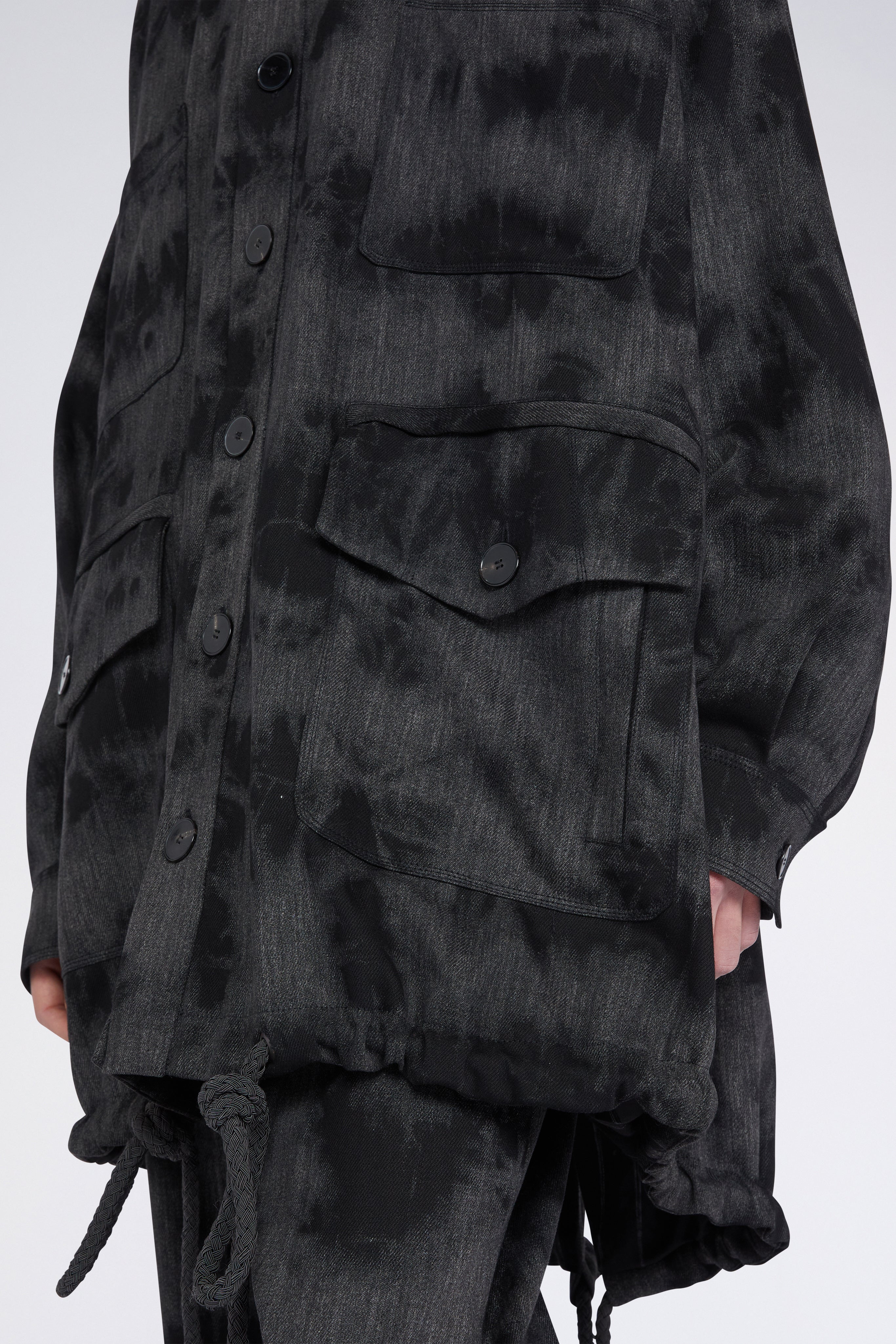 Oversized, dark gray coat made of 100% cotton with a textured tie-dye pattern, large front pockets, button closure, and an adjustable drawstrings at the hem for a relaxed fit.