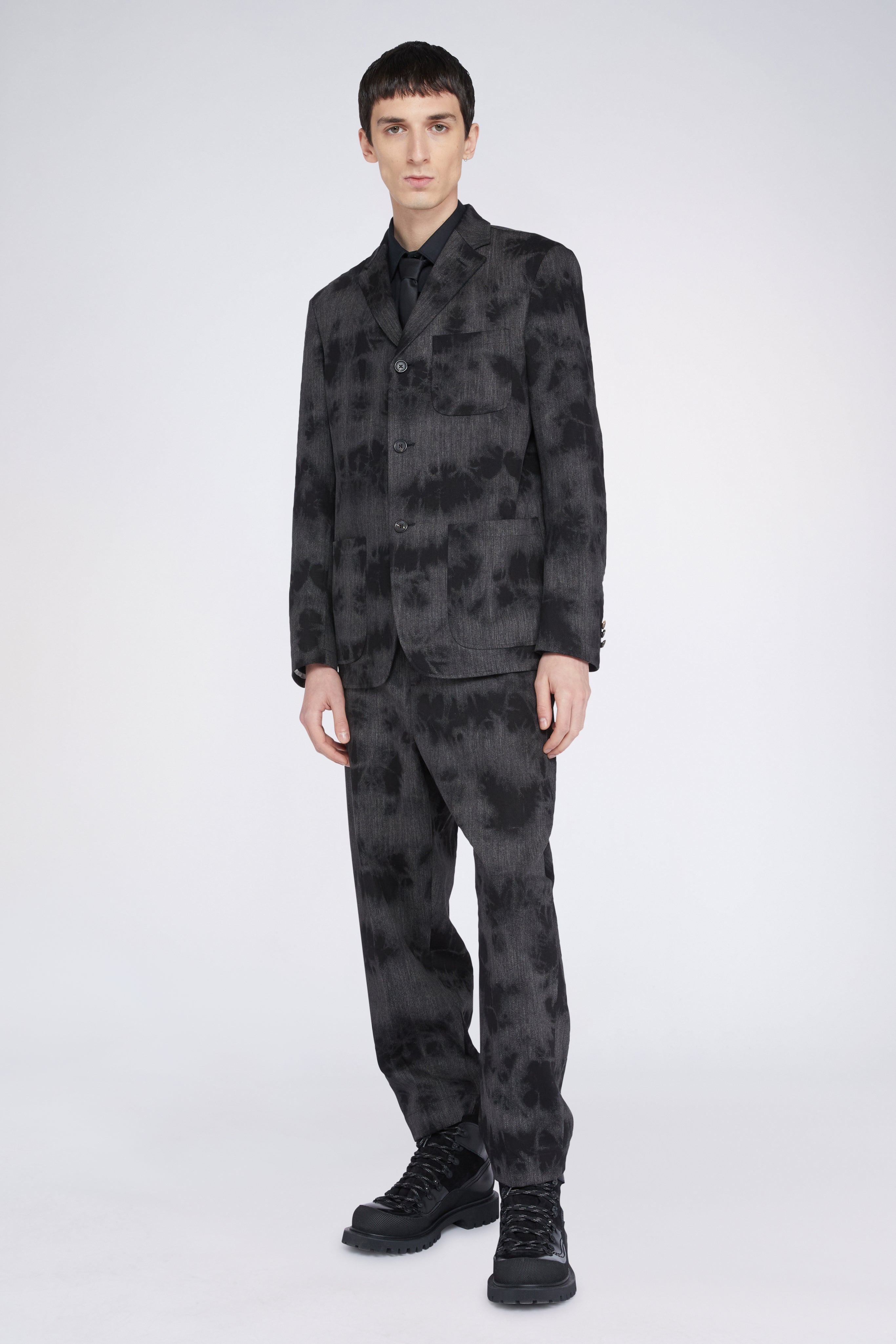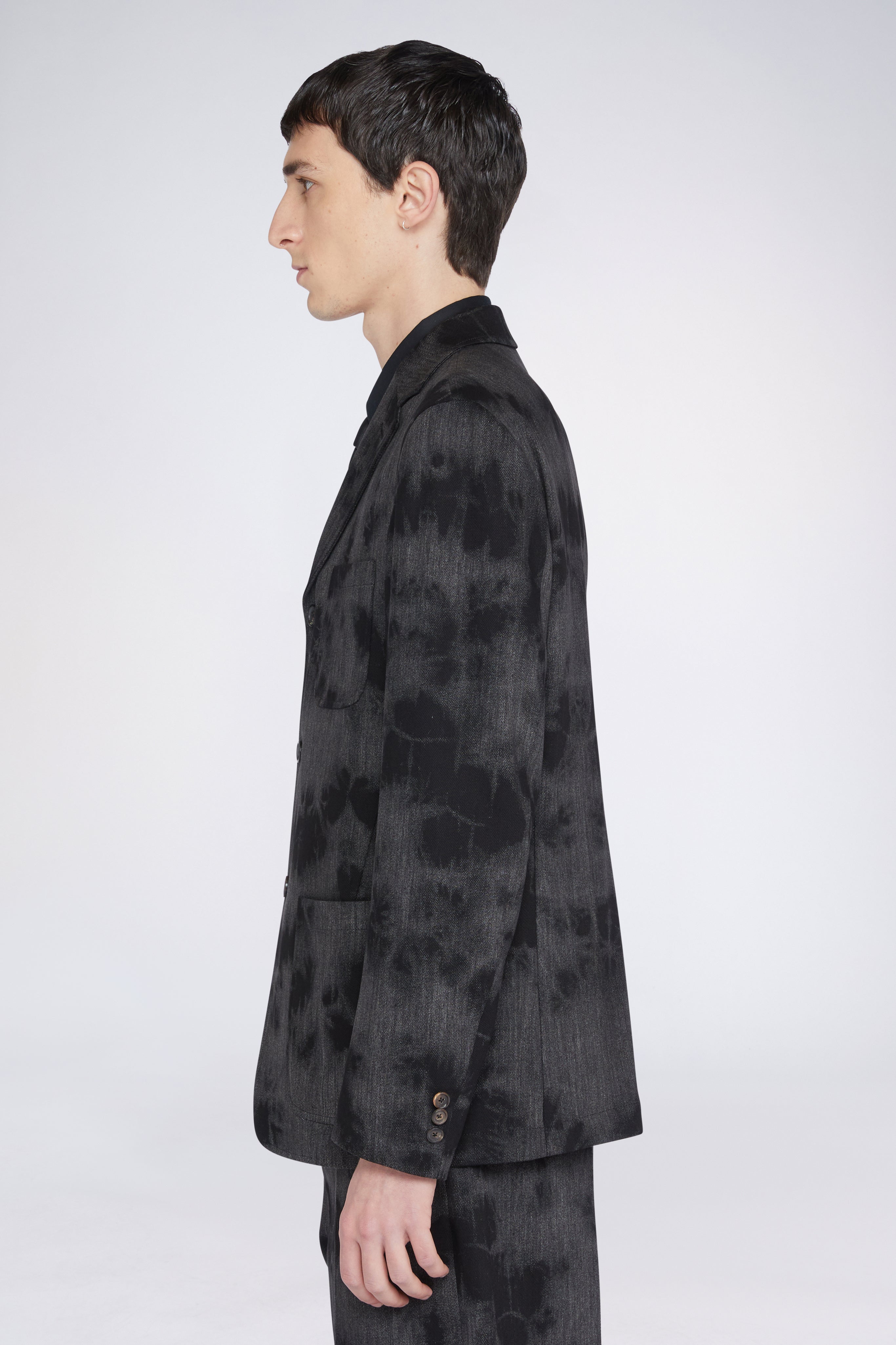 Tailored jacket made of 100% cotton with a three-button closure, notched lapels, and large patch pockets.