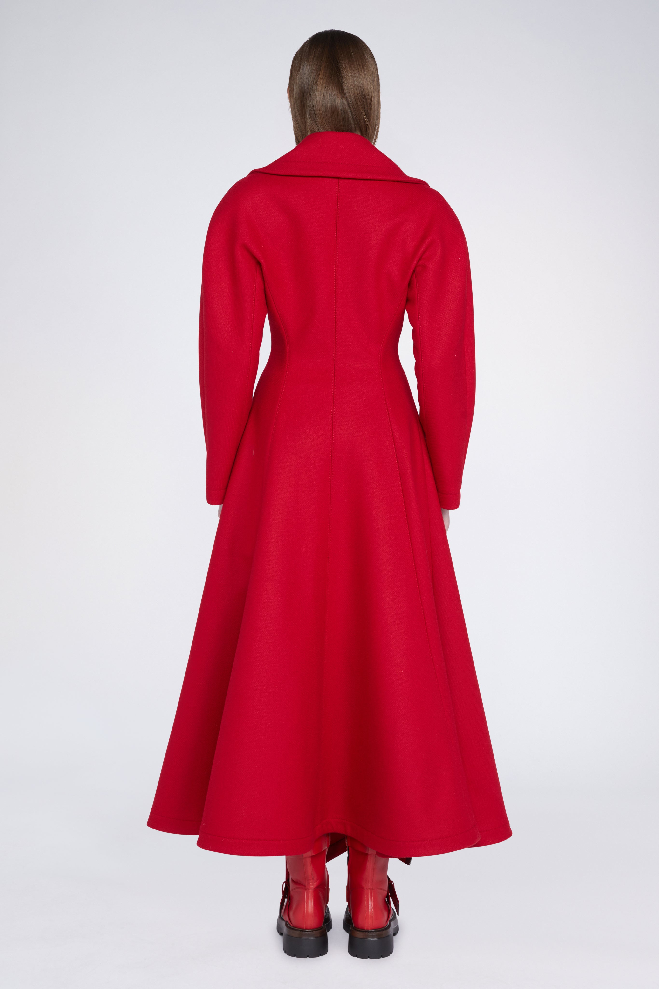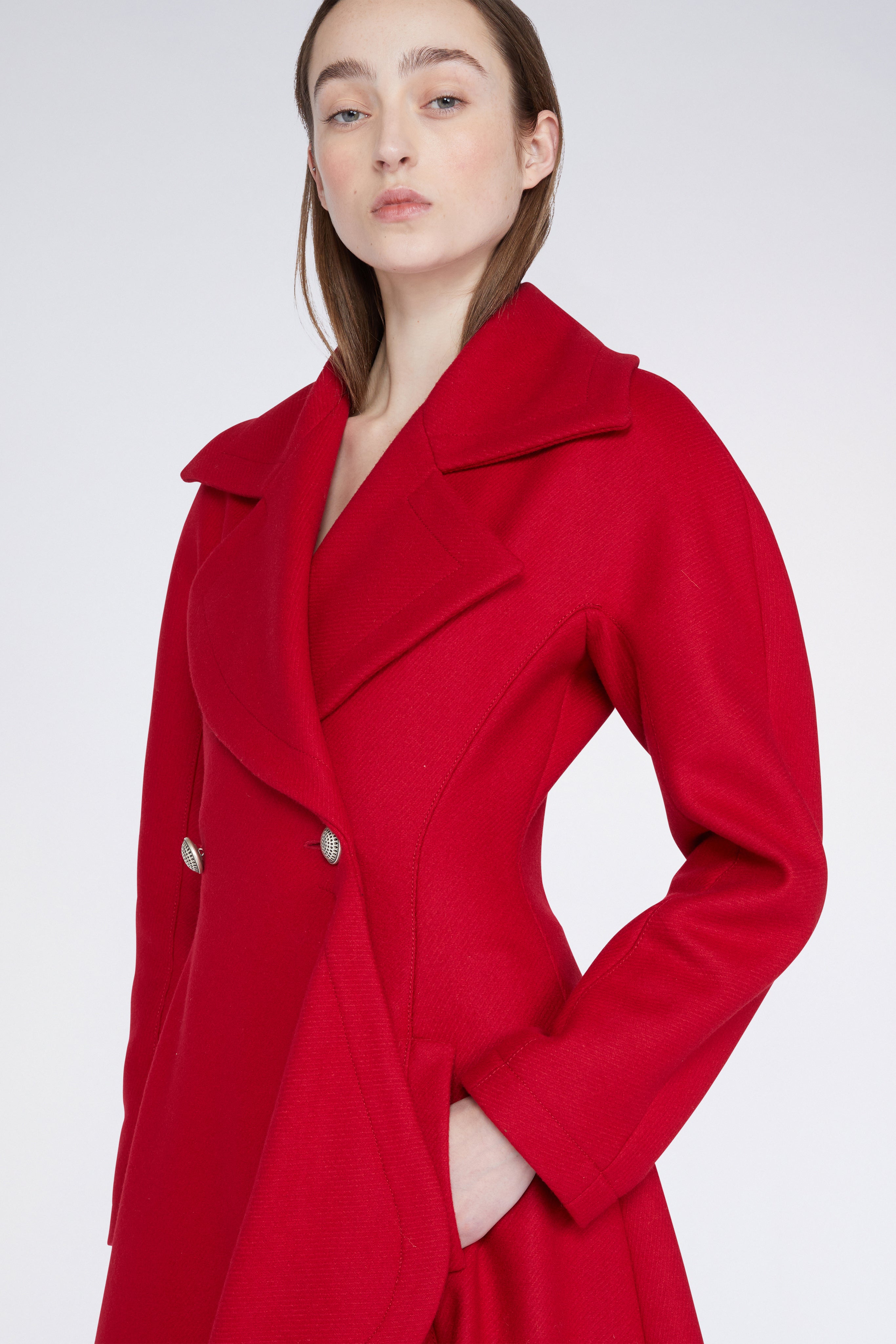 • Long red coat in wool-blend fabric with a 2-button closure.
