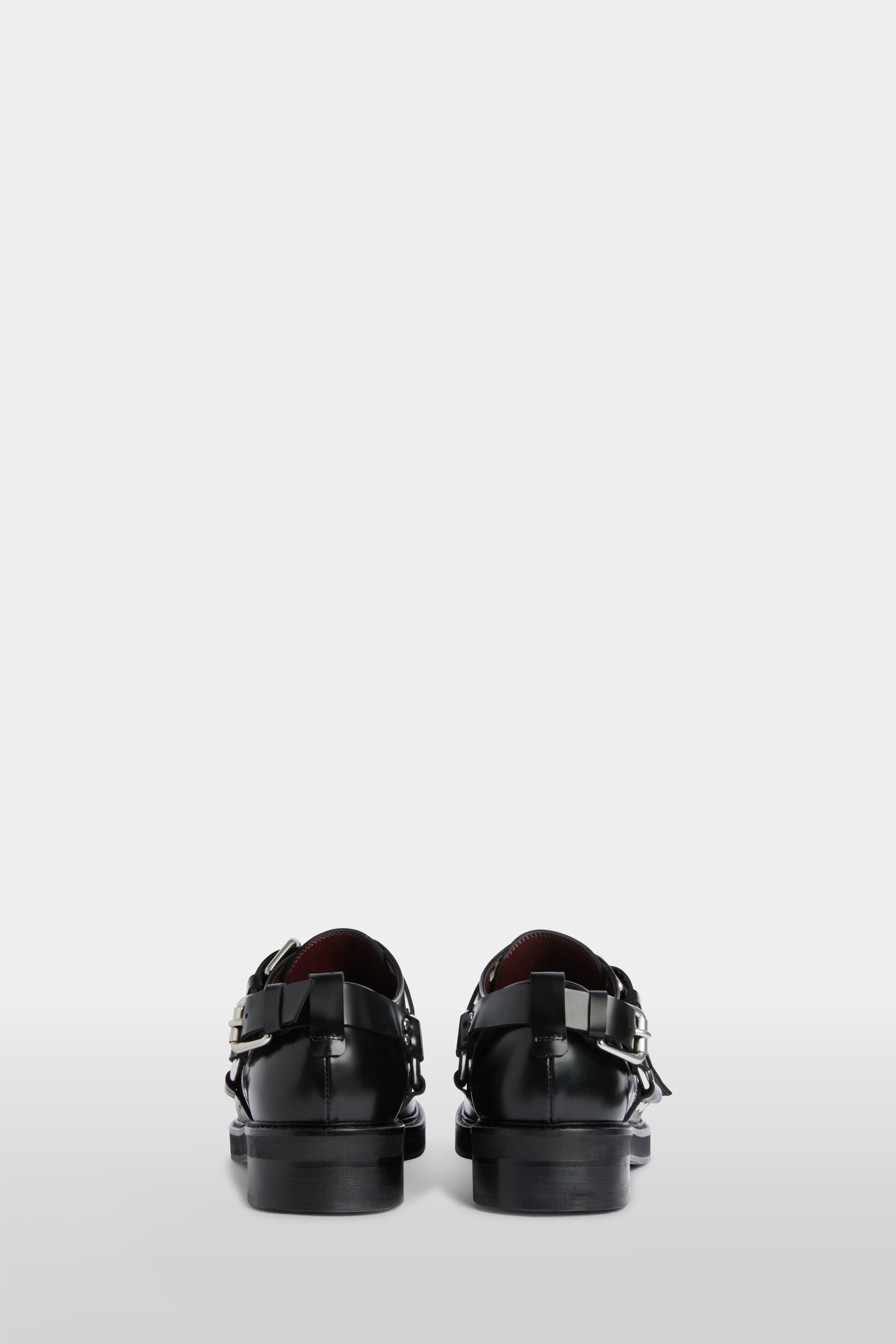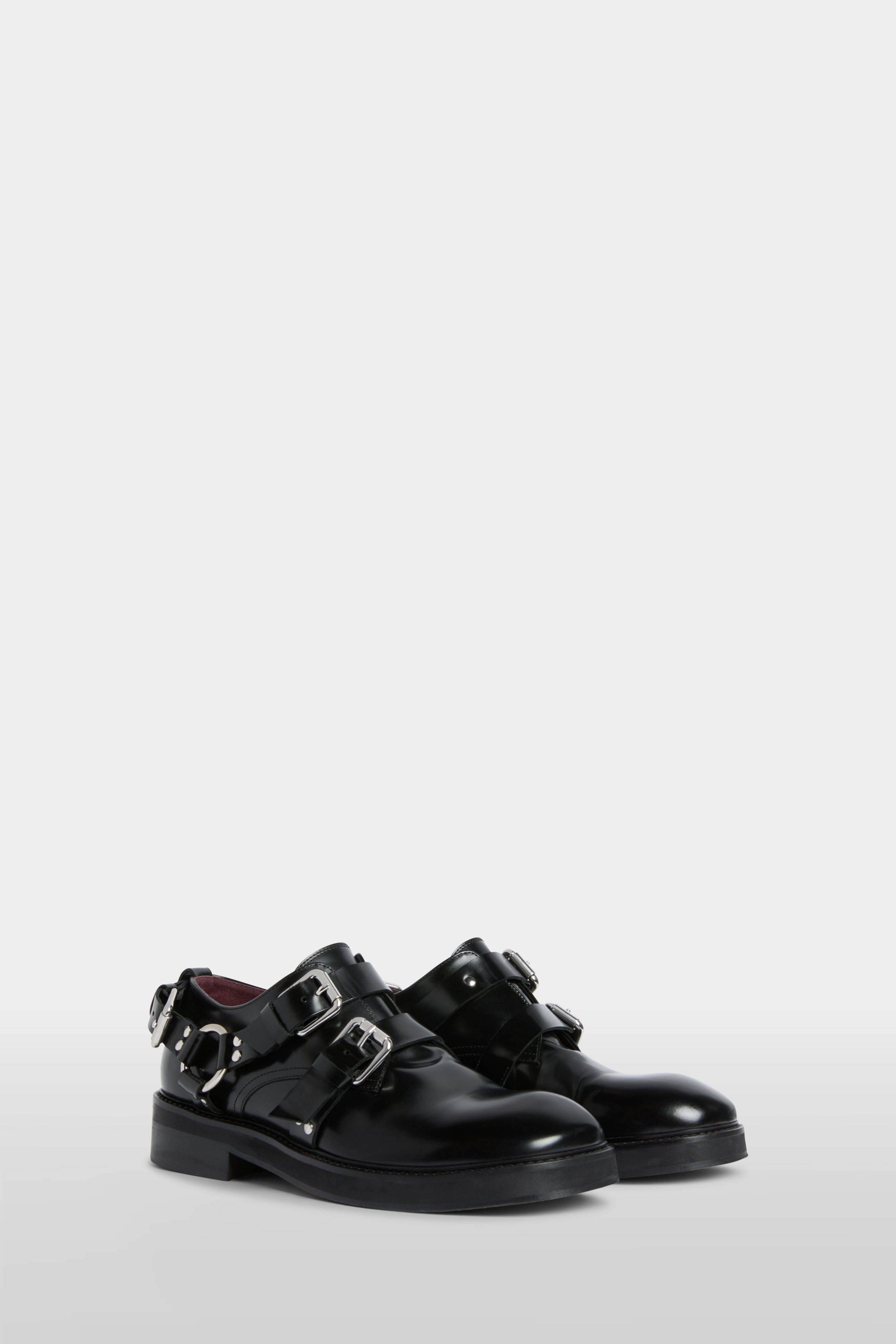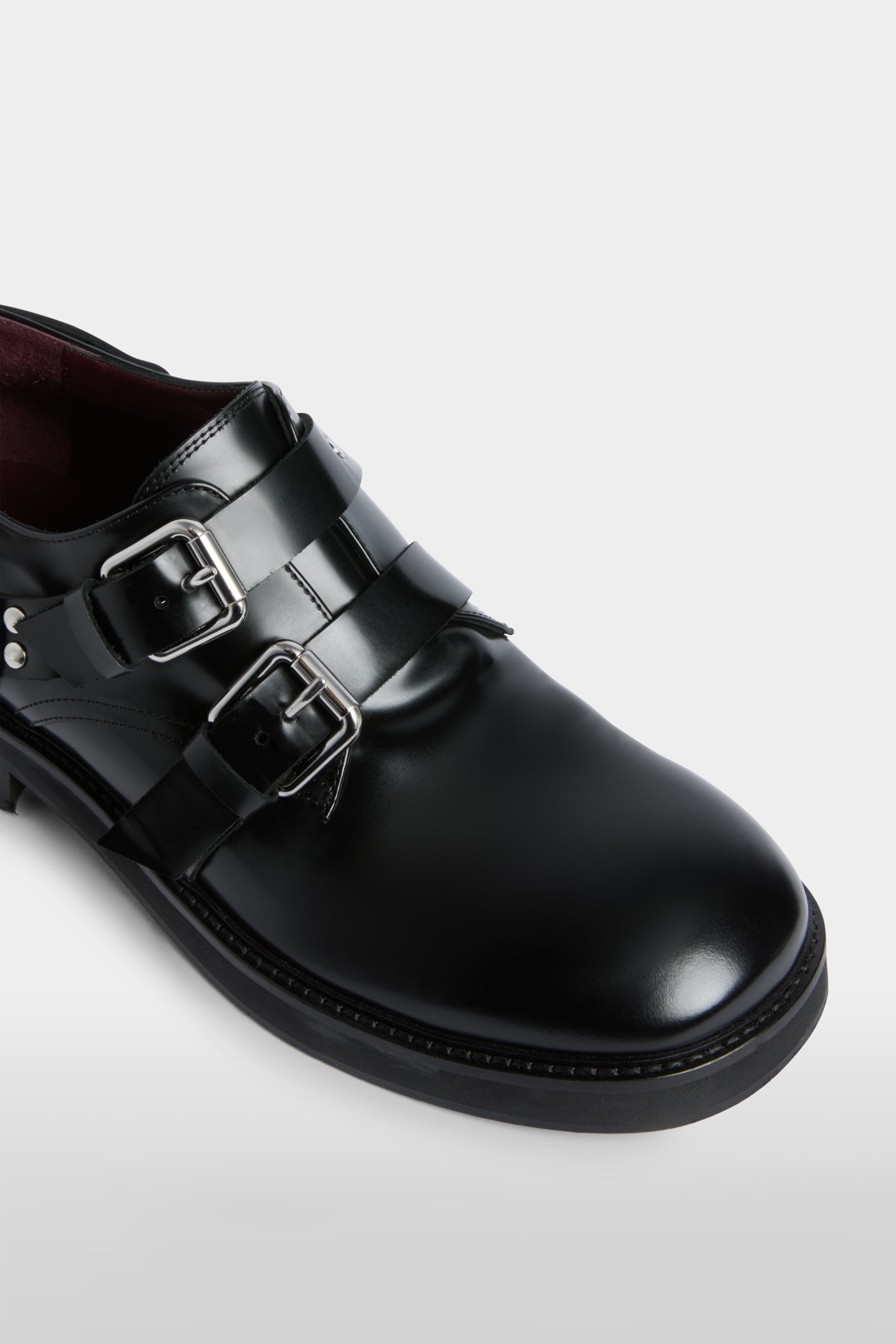 • Black derby shoes crafted in 100% polished bovine leather. Featuring double buckle straps with metal hardware and side harness detail for a bold, contemporary edge. A statement design combining classic tailoring with modern attitude.