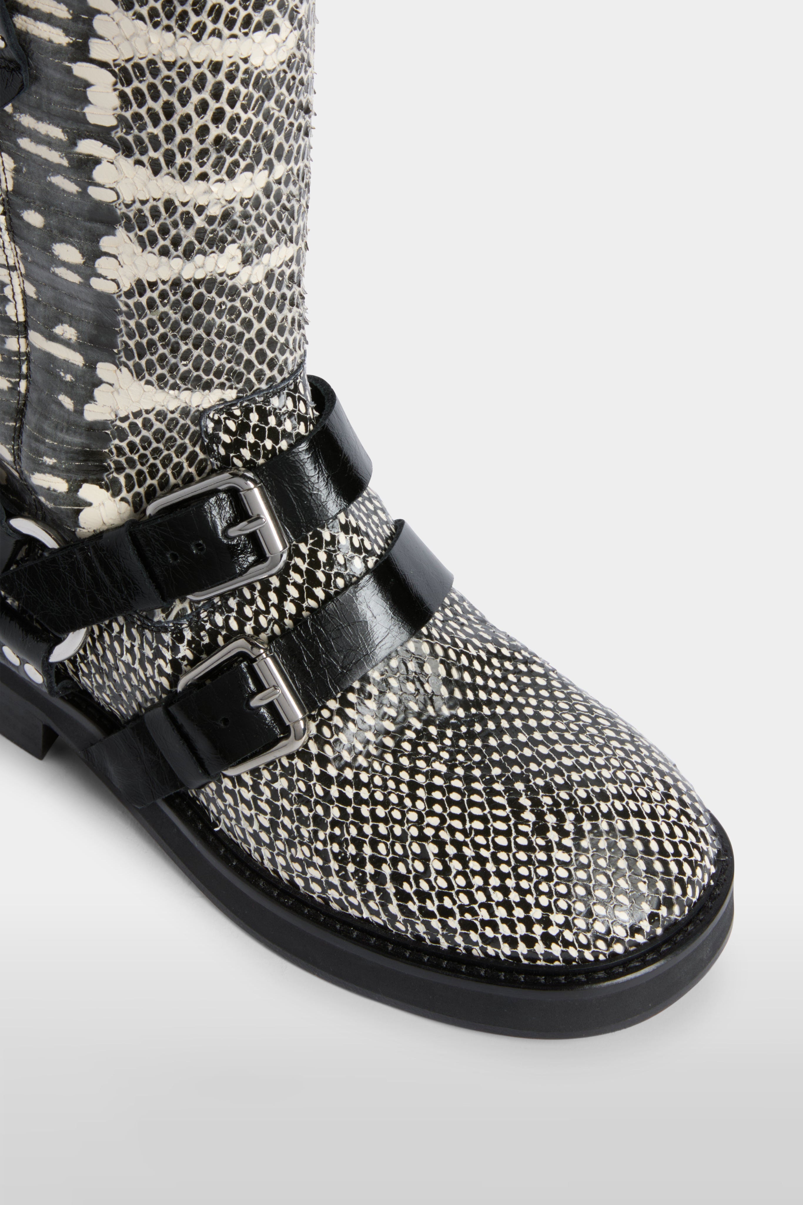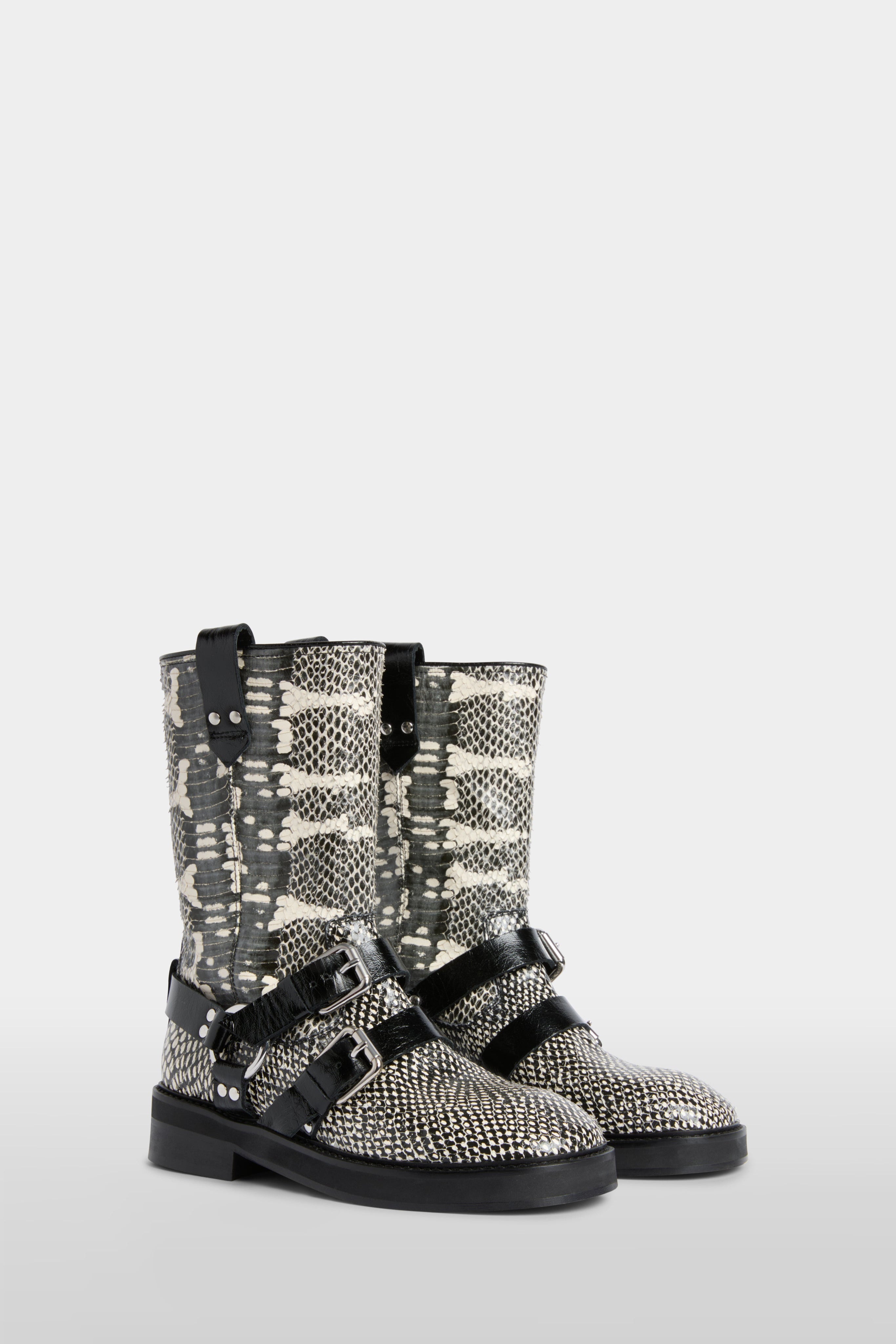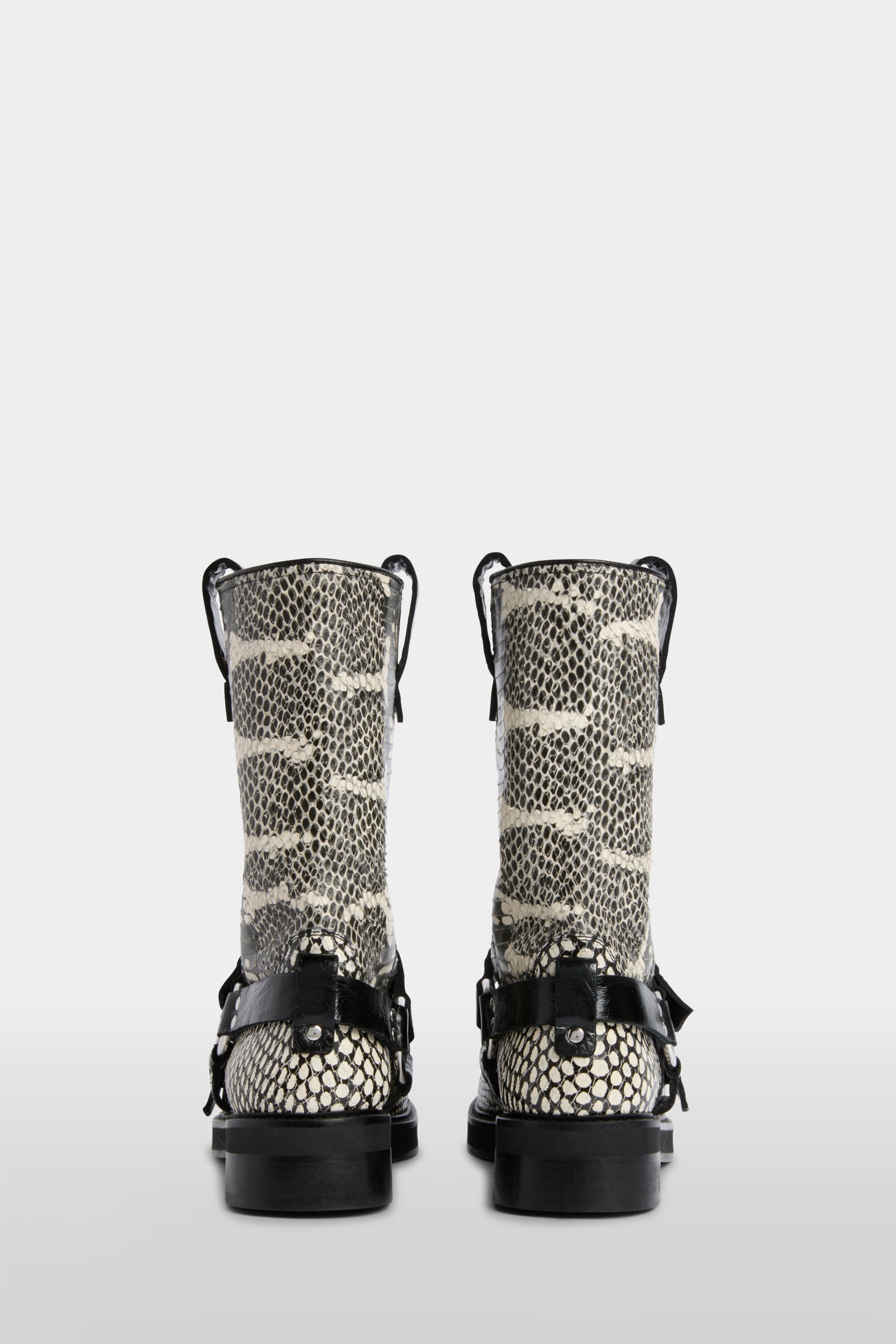 These mid-calf biker boots are crafted in python-effect leather in black and white. Two adjustable buckle straps and a side strap with ring hardware add structure, with pull tabs and a round toe completing the design. They are finished with a leather lining and a sturdy leather sole for everyday wear.