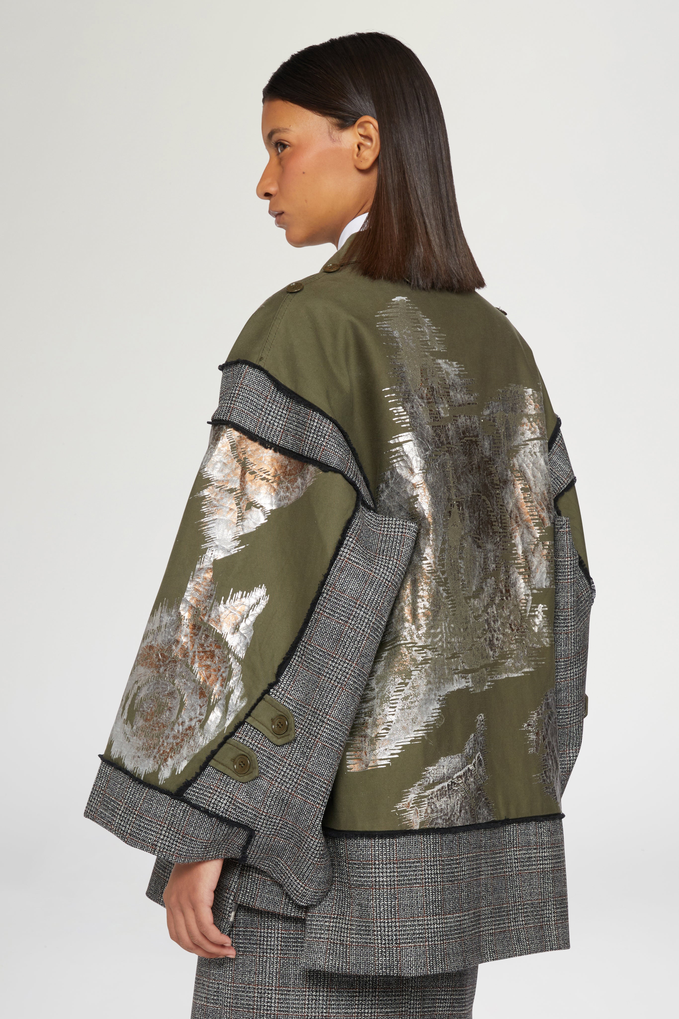 • Oversized khaki parka with rose patchwork details and metallic finish, contrasted by Prince of Wales check inserts. Features patch pockets, wide sleeves, and a relaxed fit for a statement look.