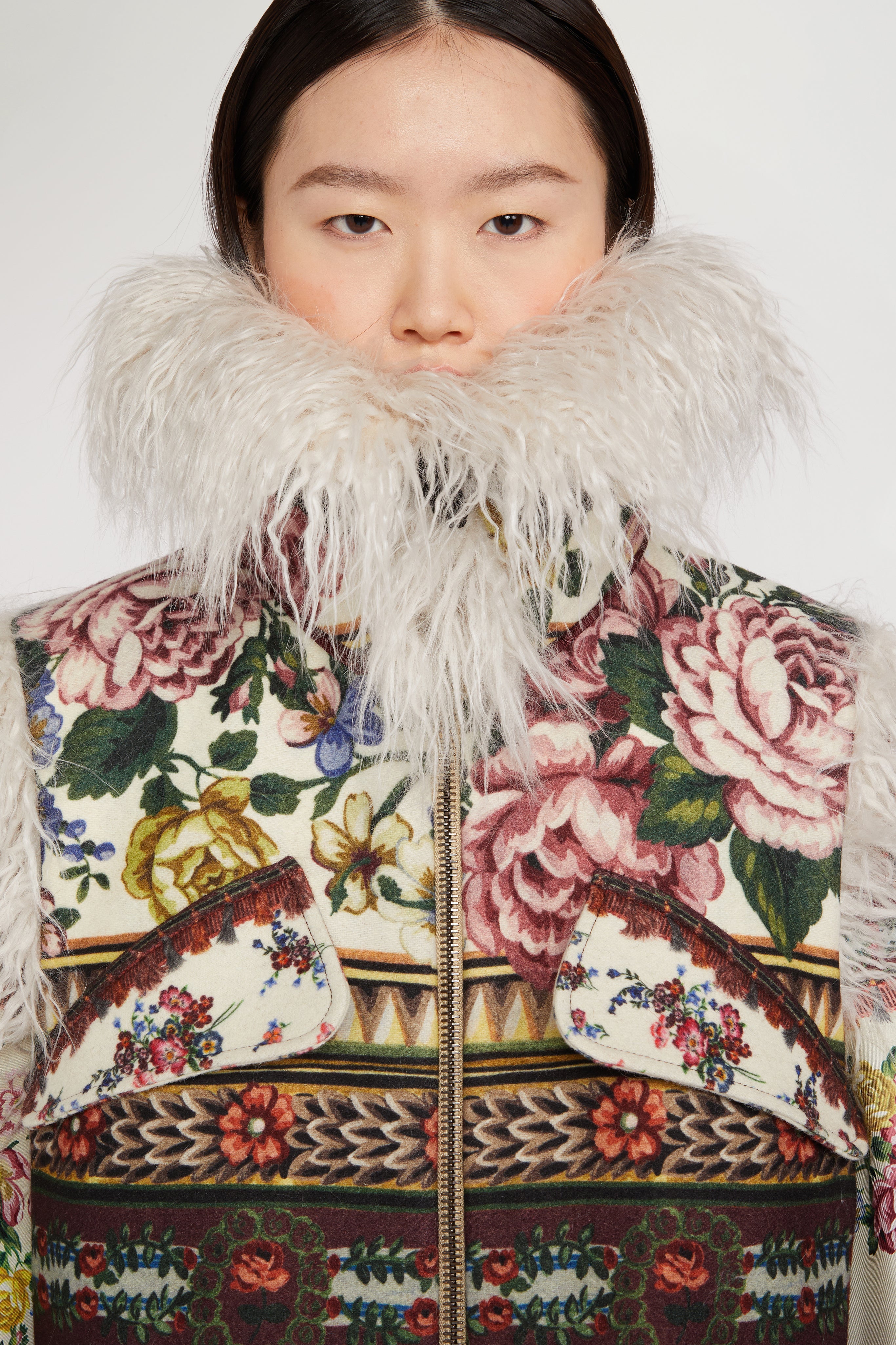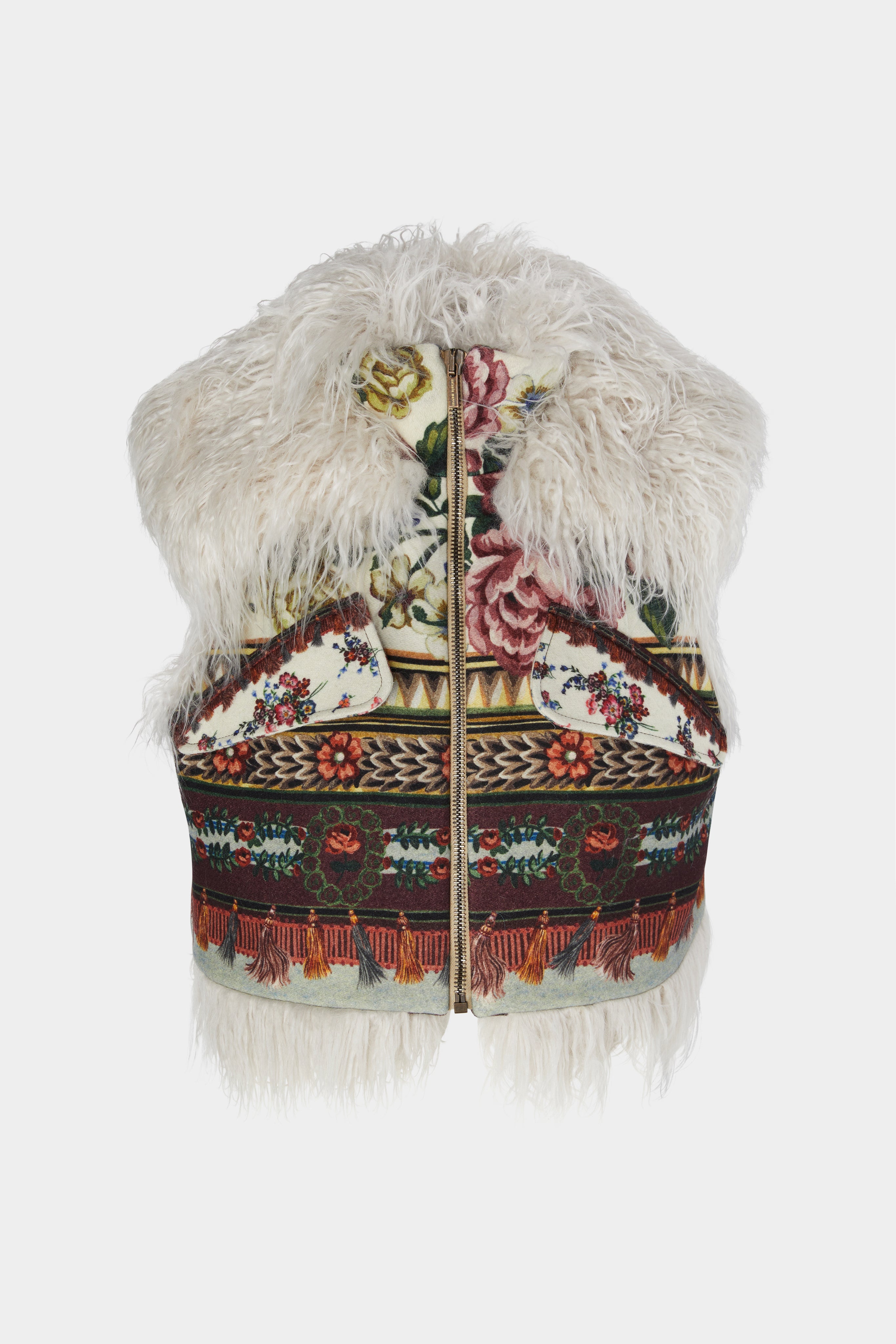 Sleeveless vest in floral jacquard with ethnic-inspired motifs, enriched by soft faux fur trims for a bold, tactile statement. A fusion of folk charm and contemporary flair.