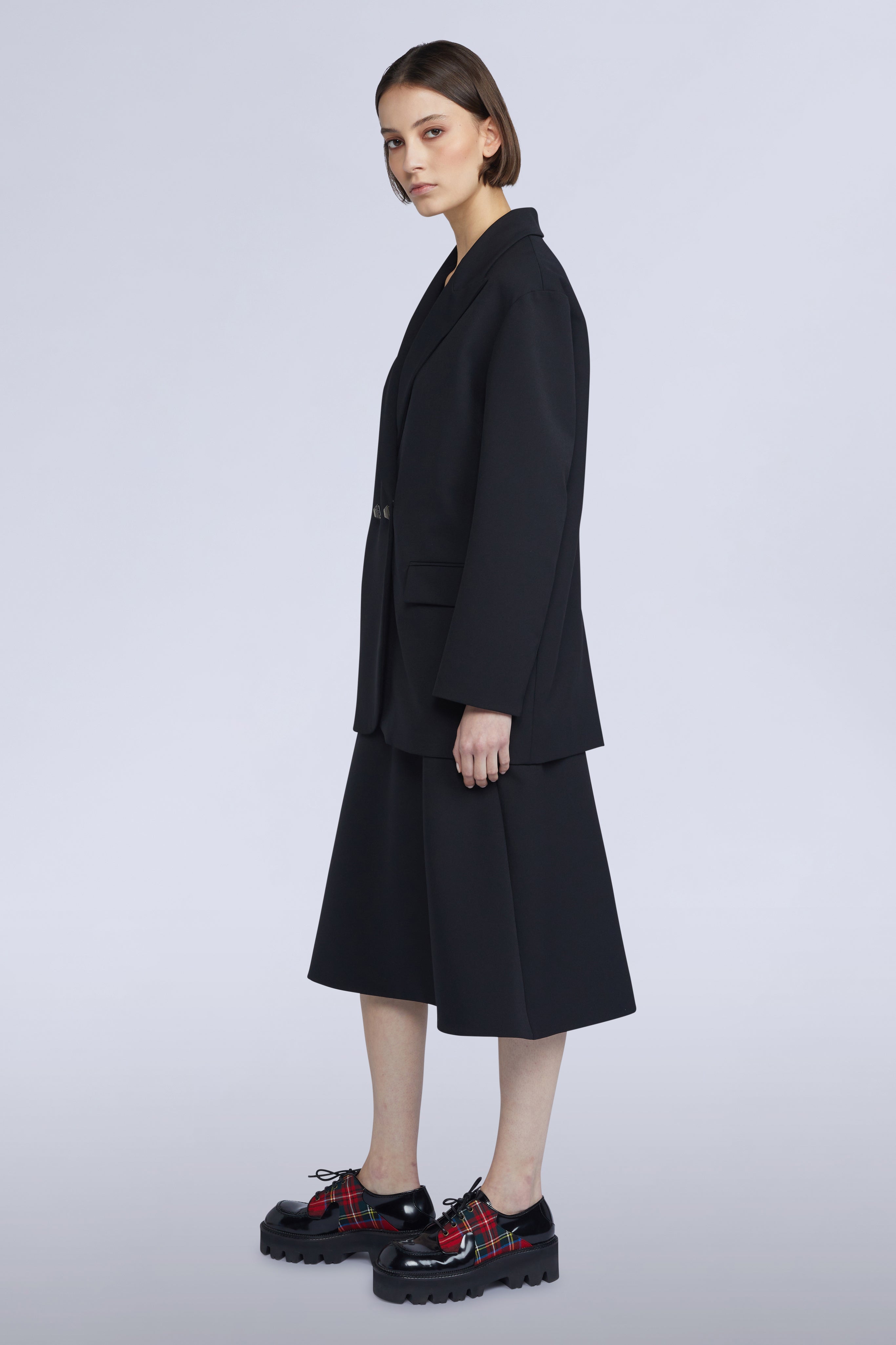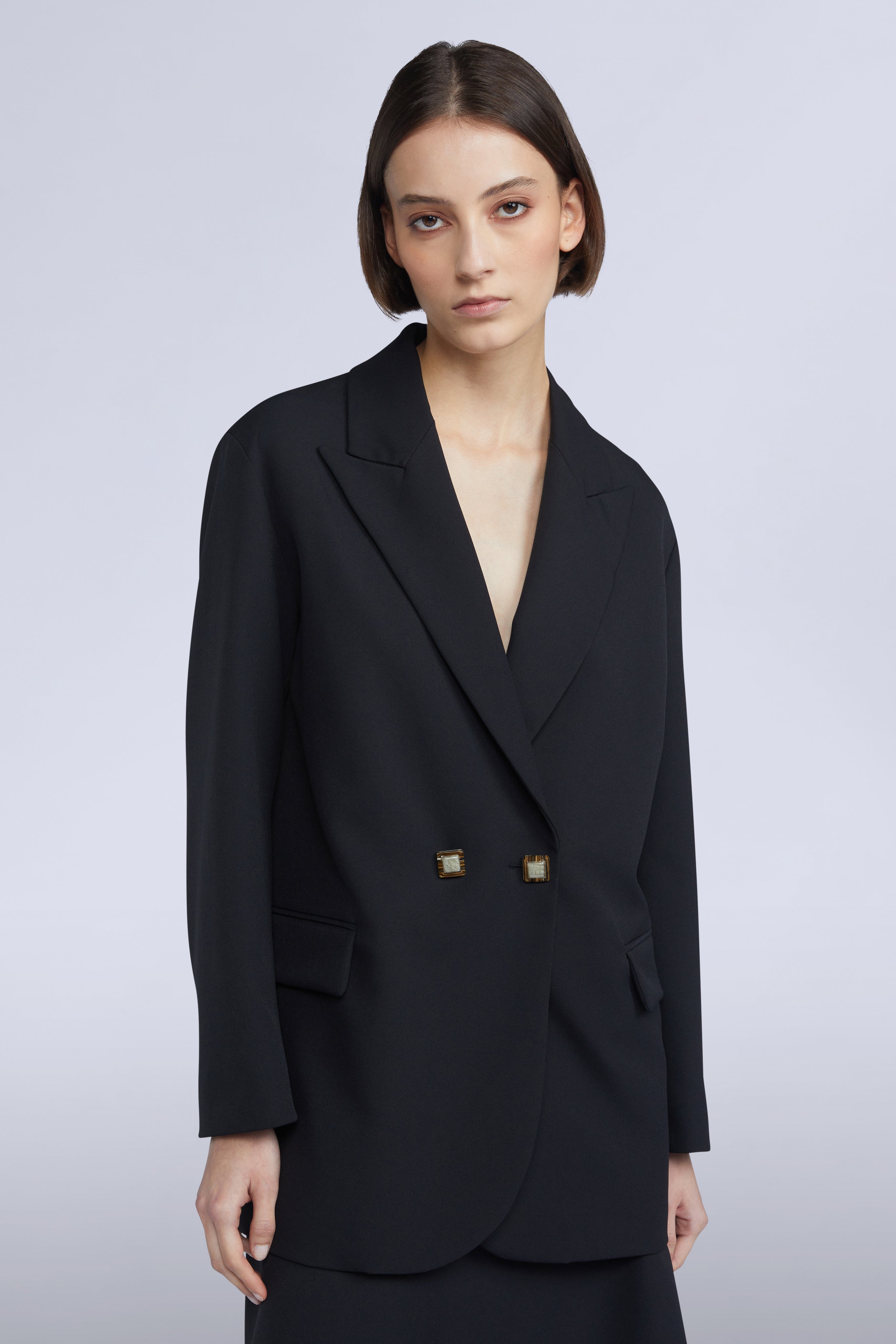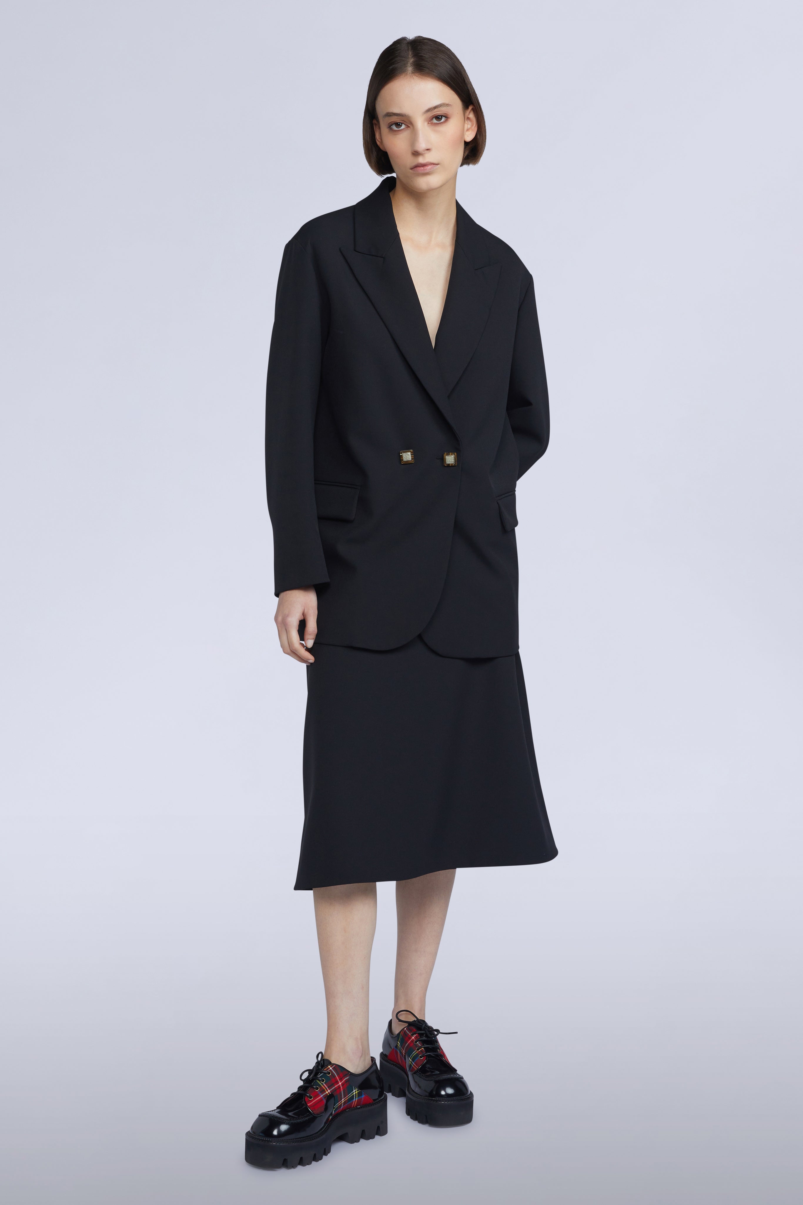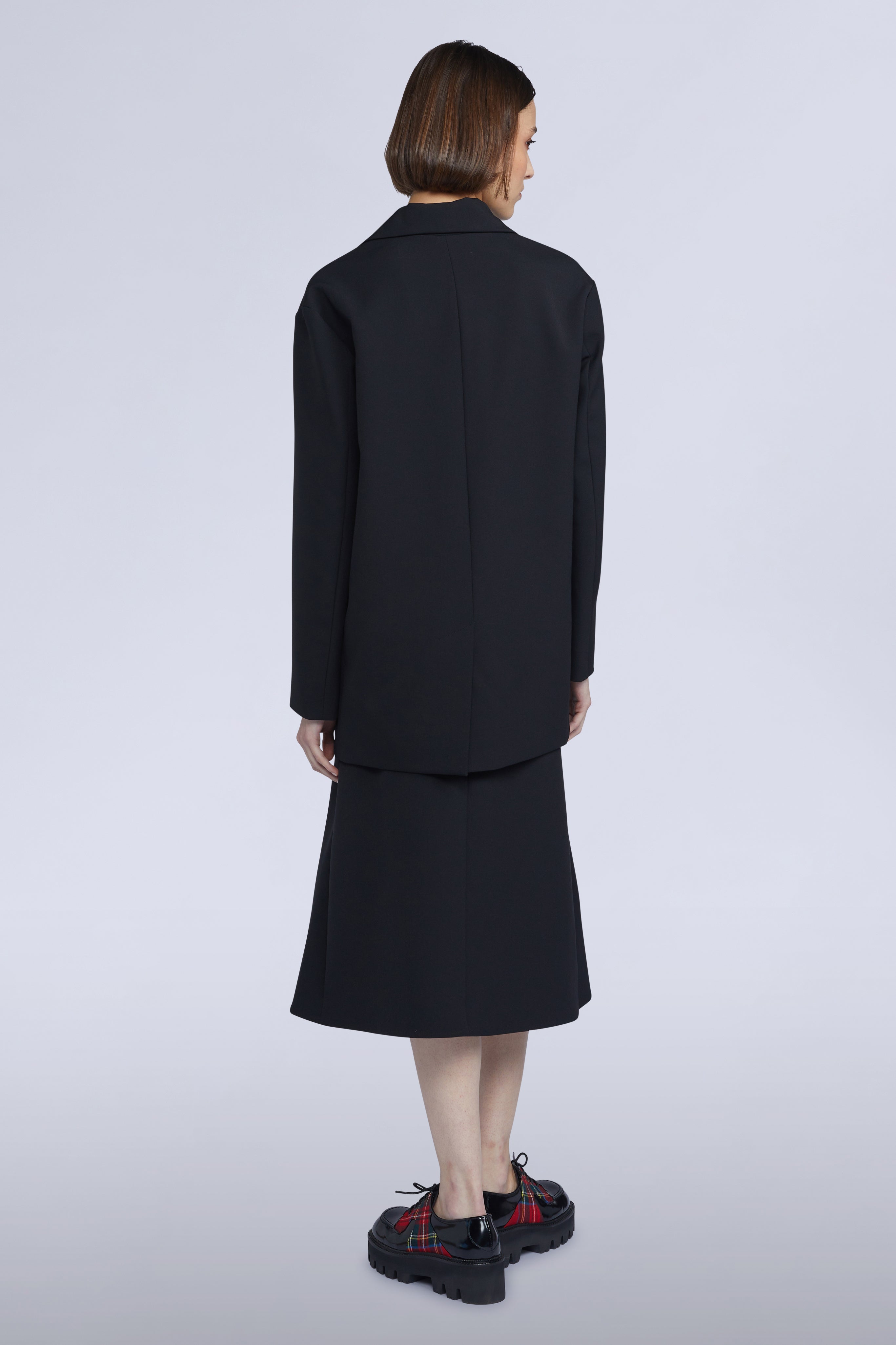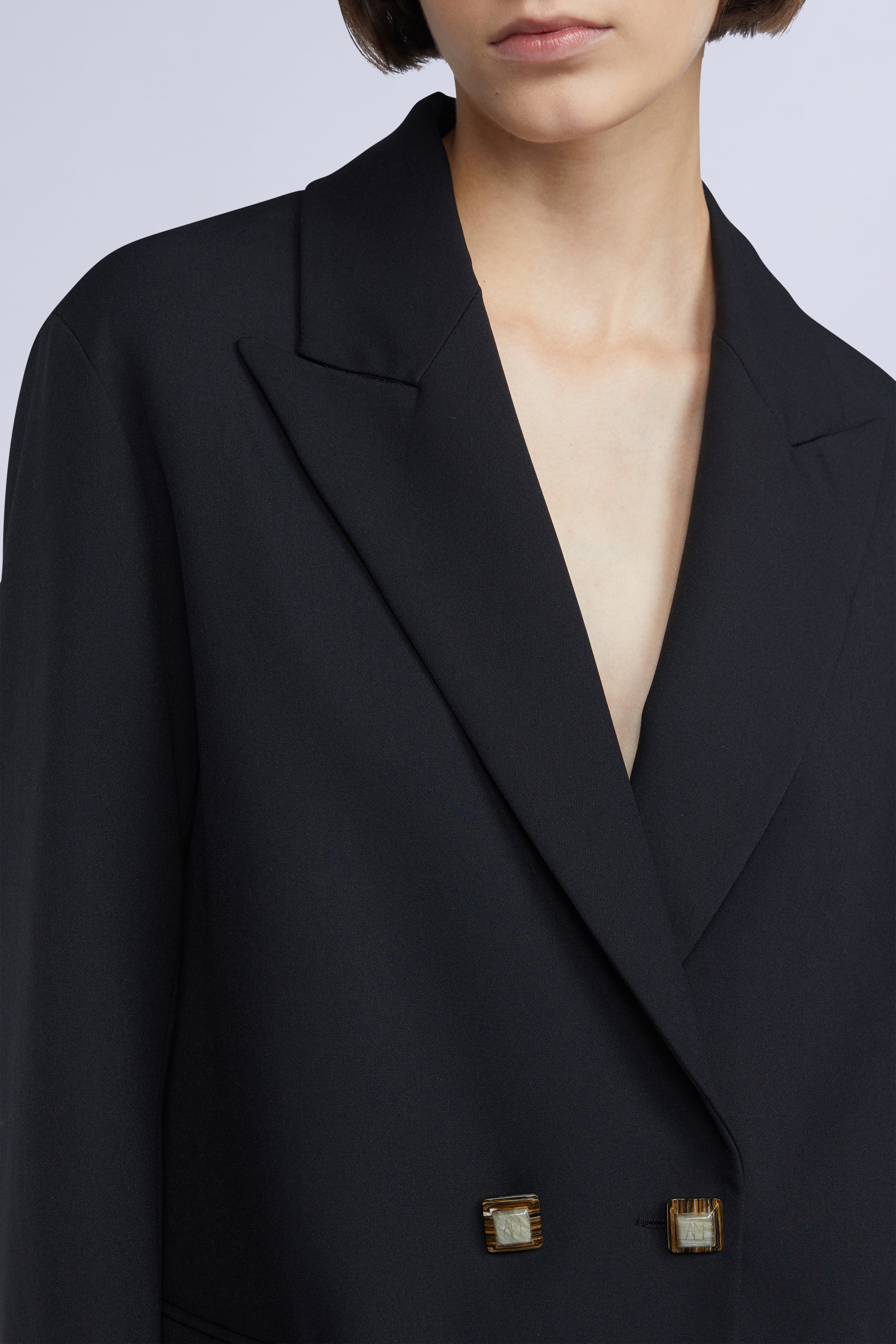Crafted in a longline silhouette and relaxed fit, the Leccio B black suit jacket has notch lapels and flap pockets. The rounded hemline embodies the Marras characteristic for modern tailoring.