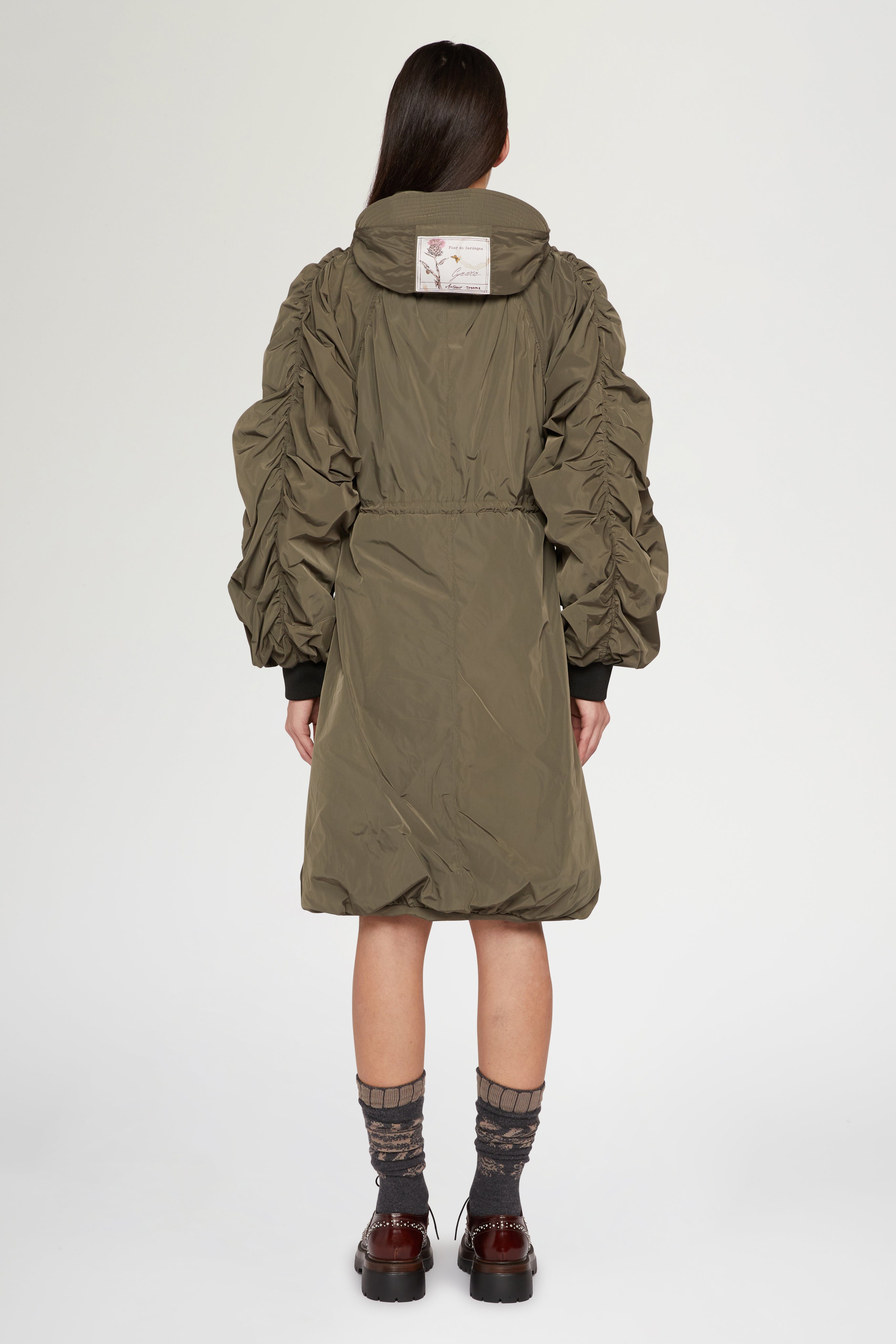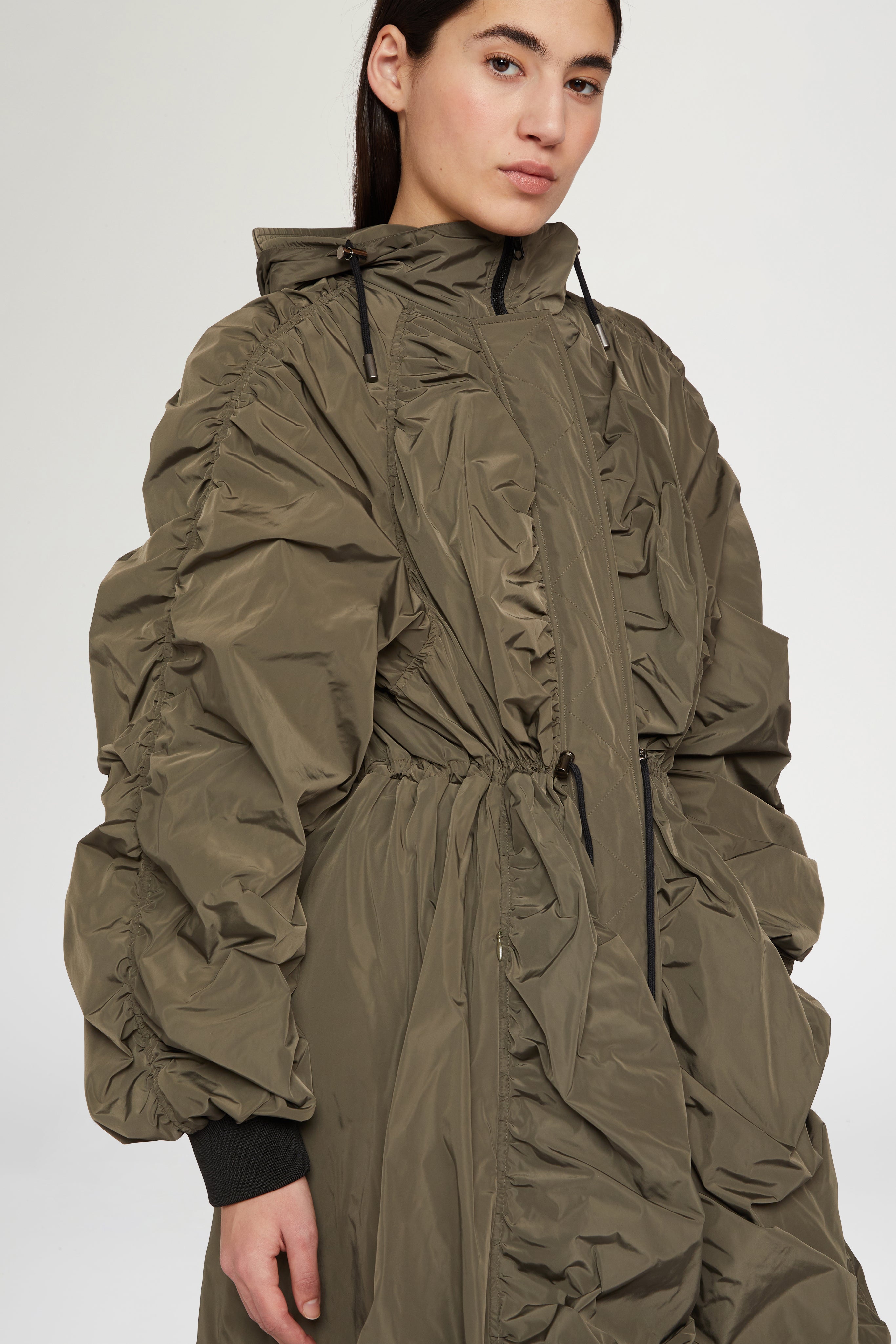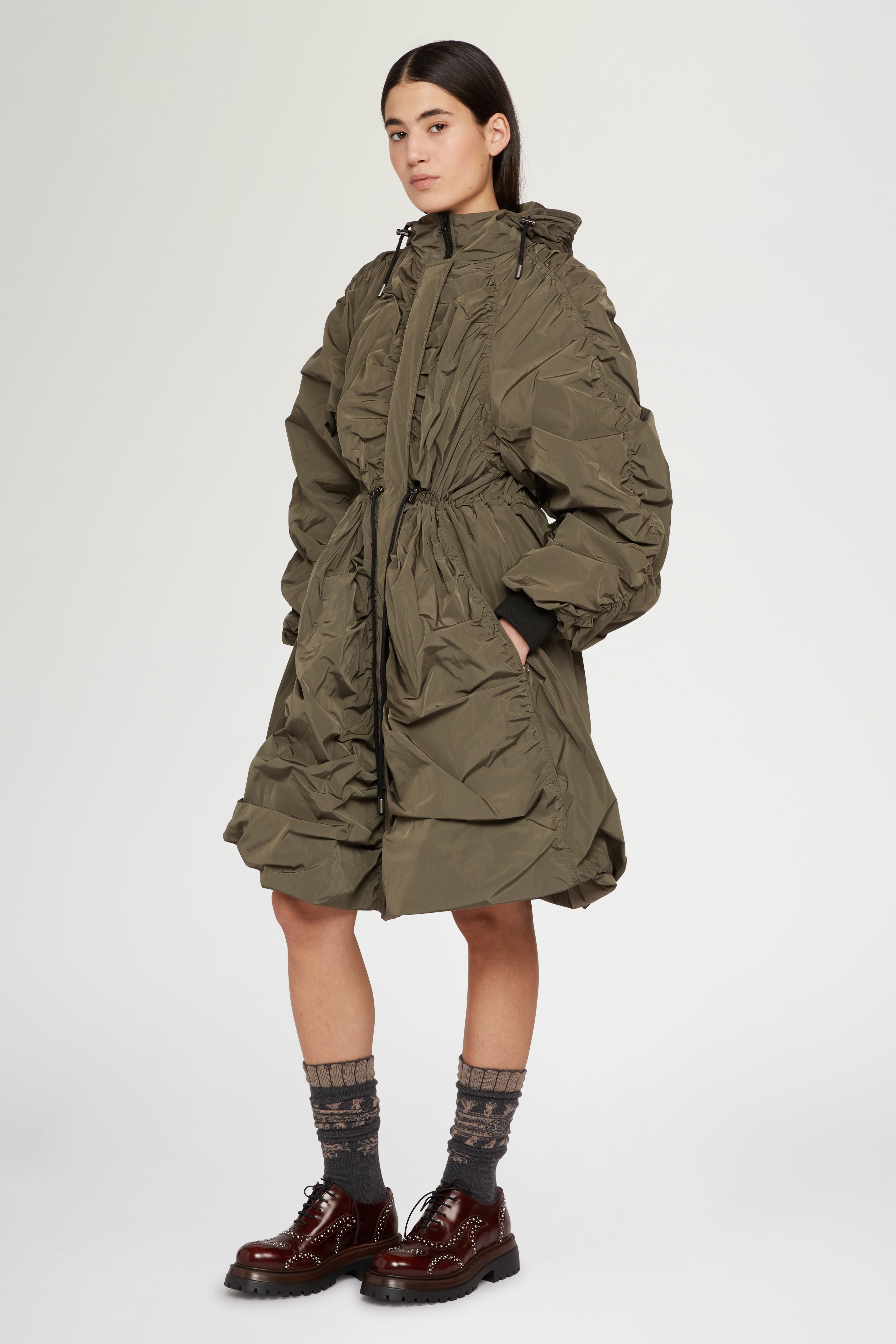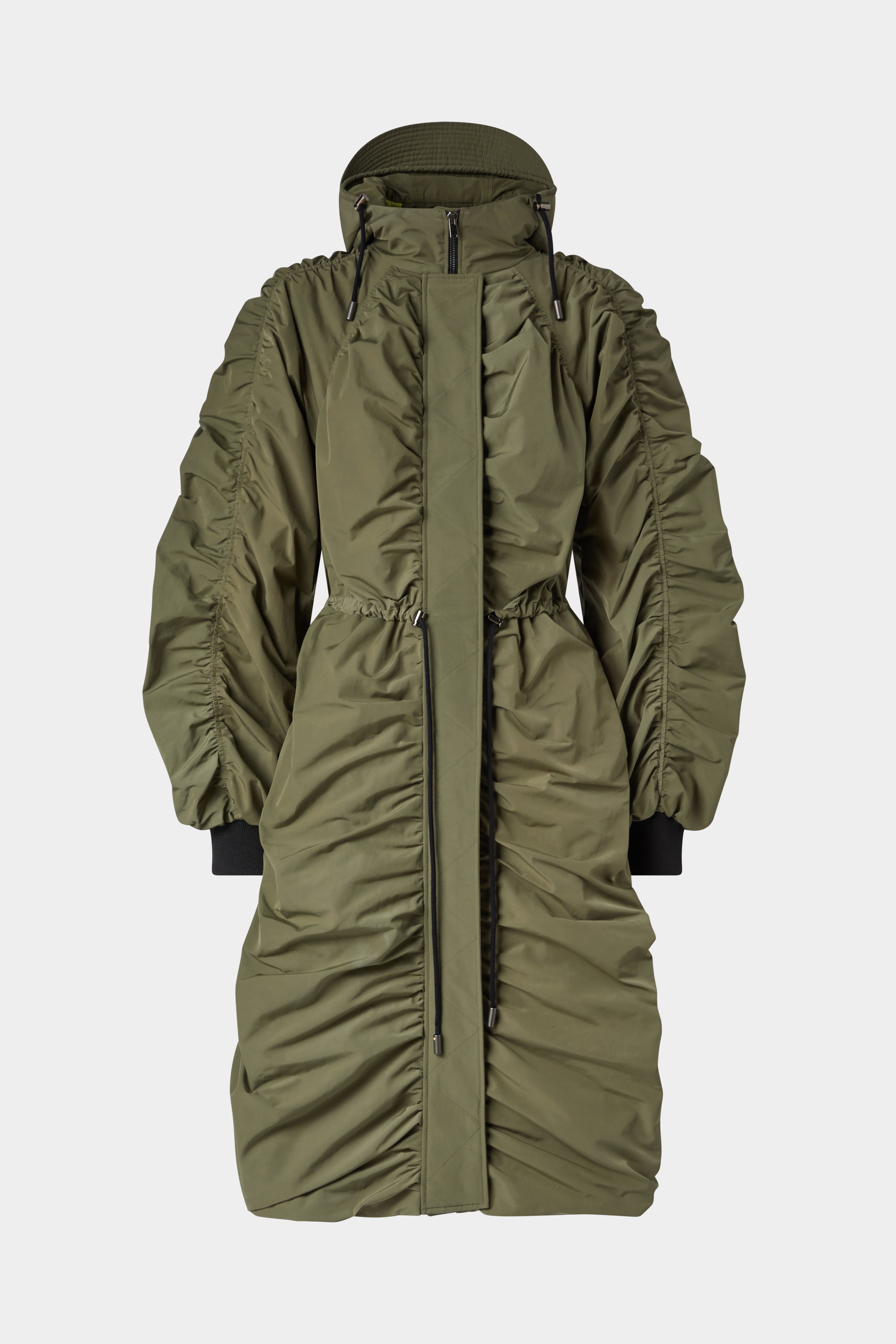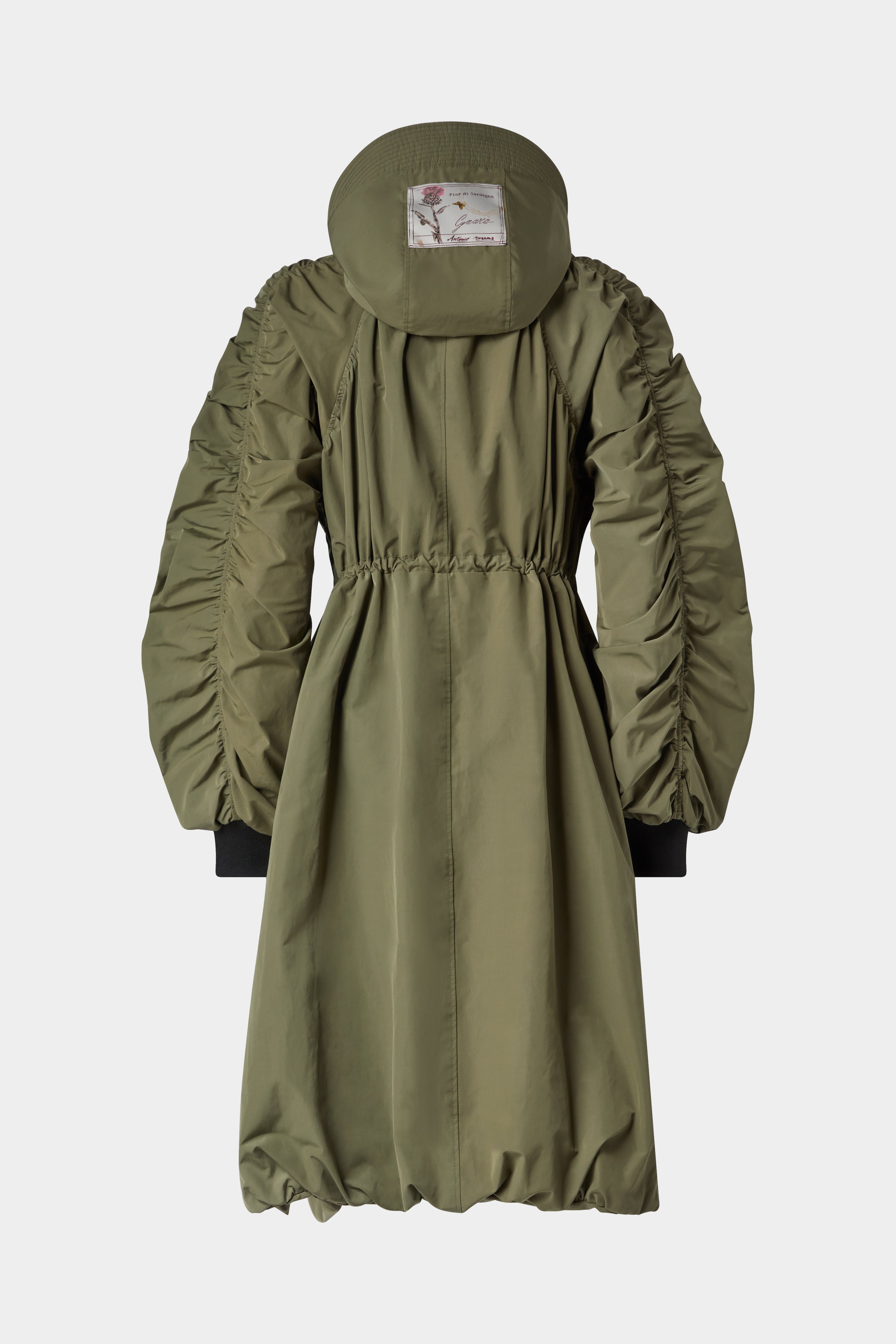 Raincoat with a ruched design, adjustable waist, and high-neck hood for a bold yet functional style.