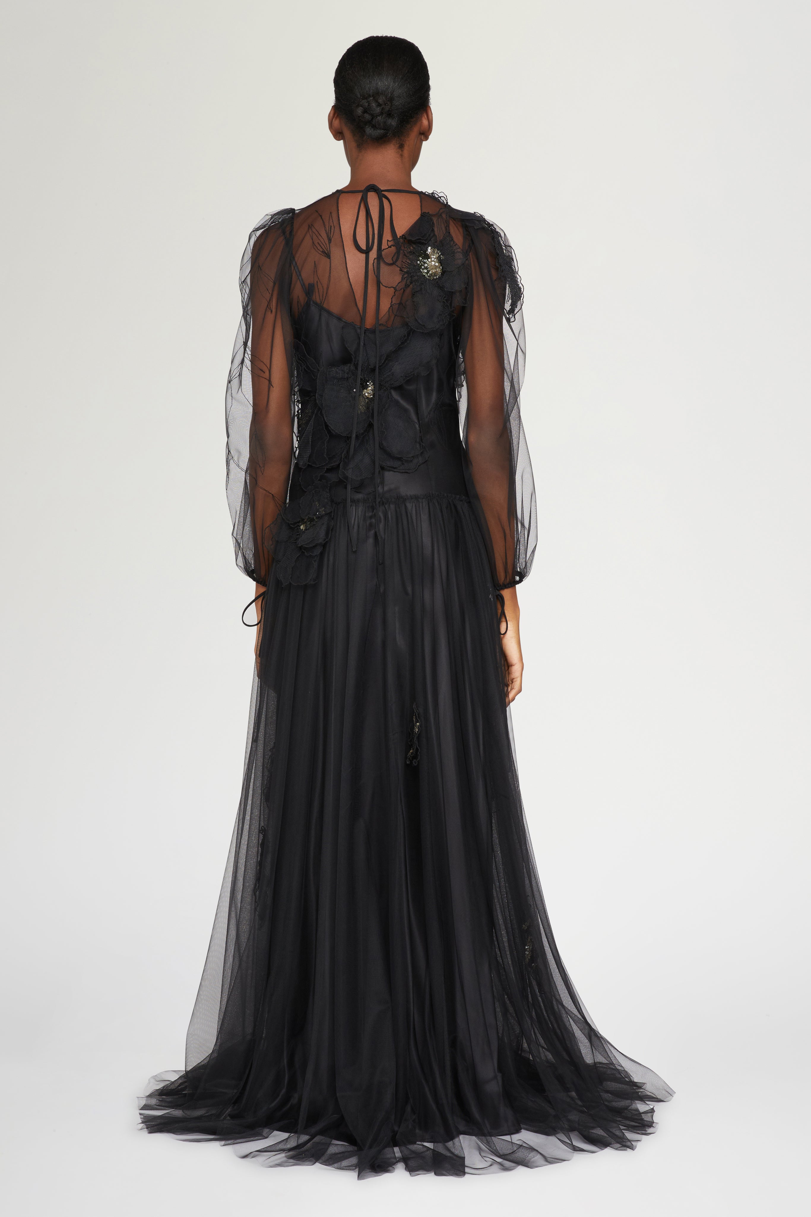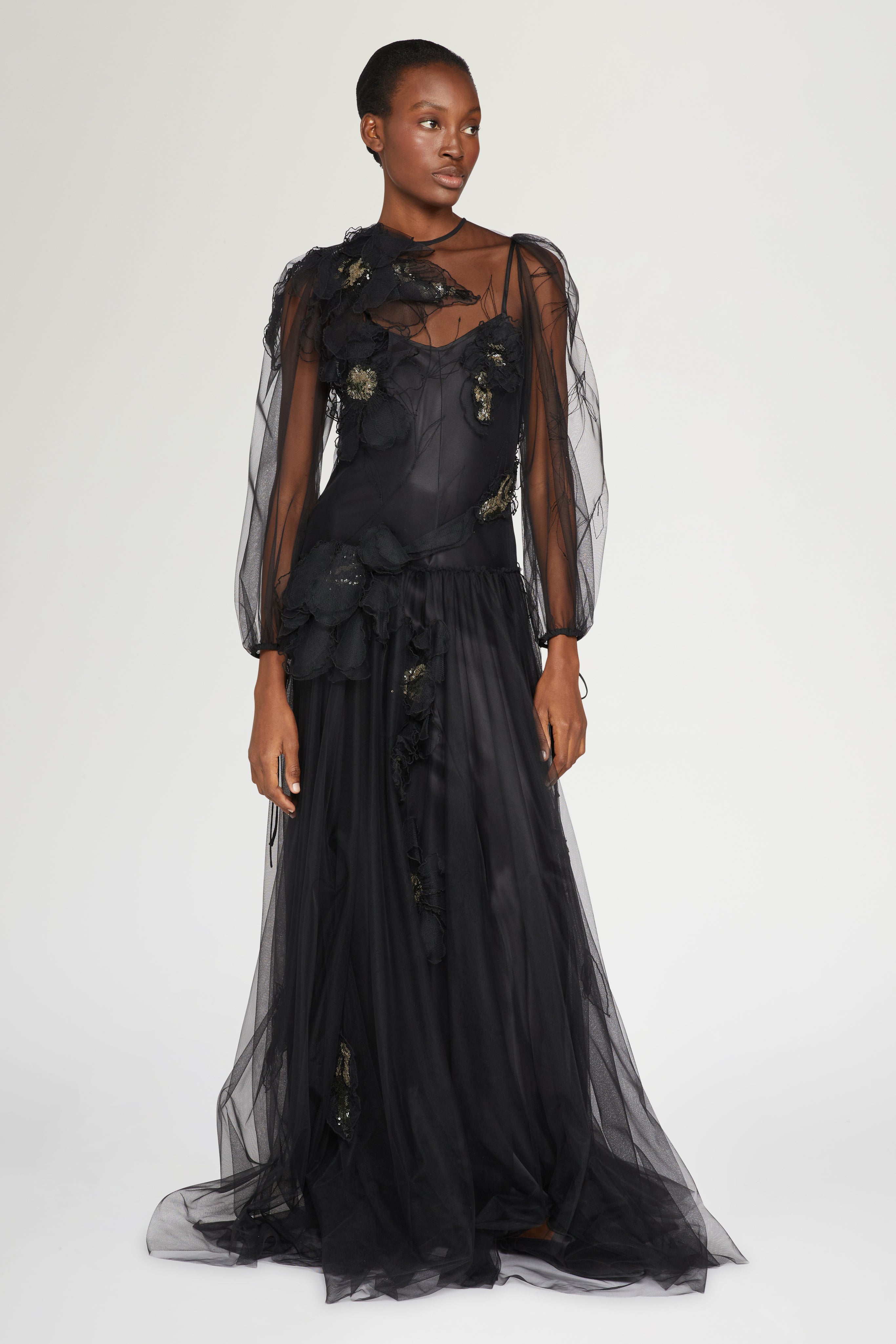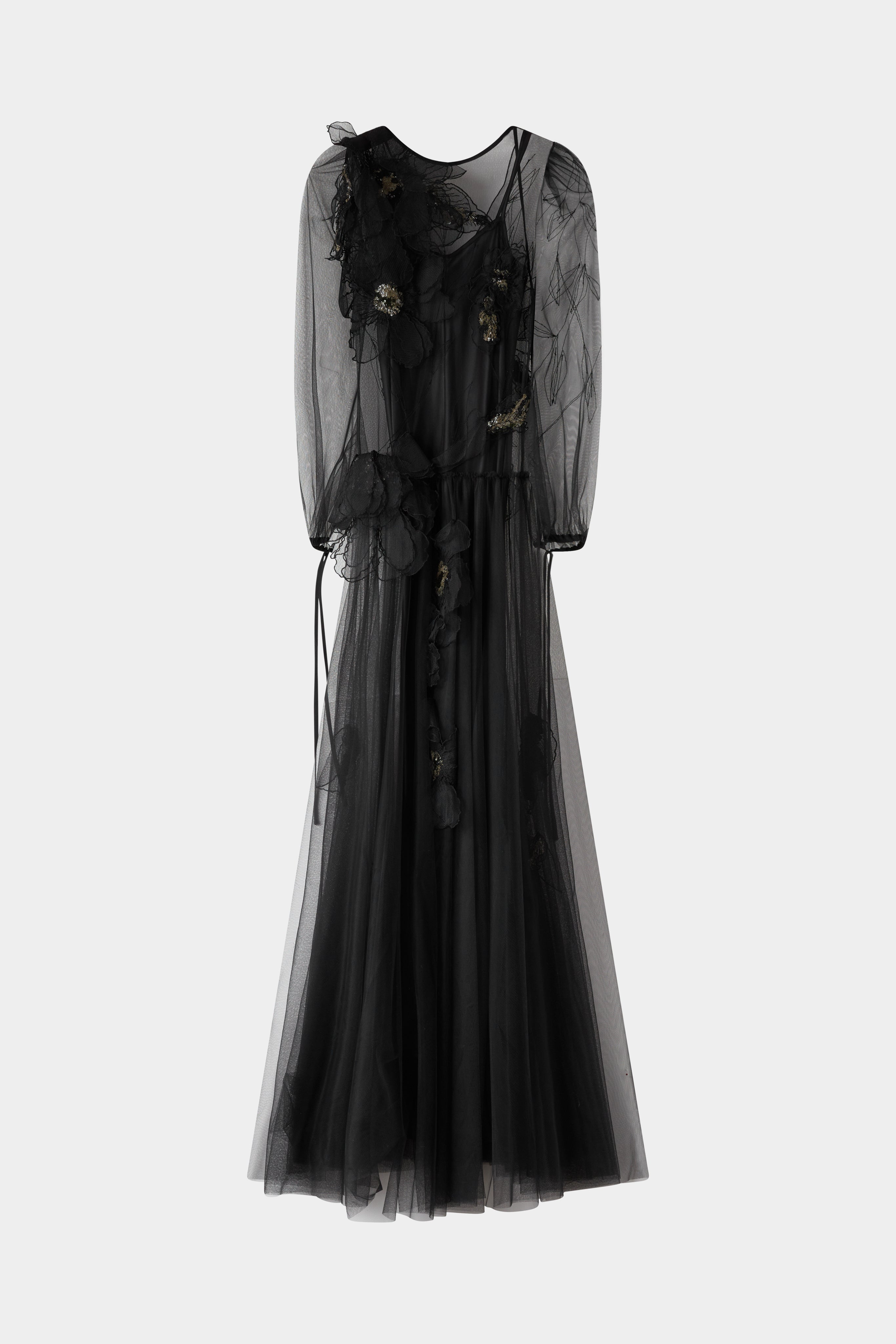 Elegant black evening gown with sheer tulle sleeves, 3D floral appliqués and a flowing silhouette.