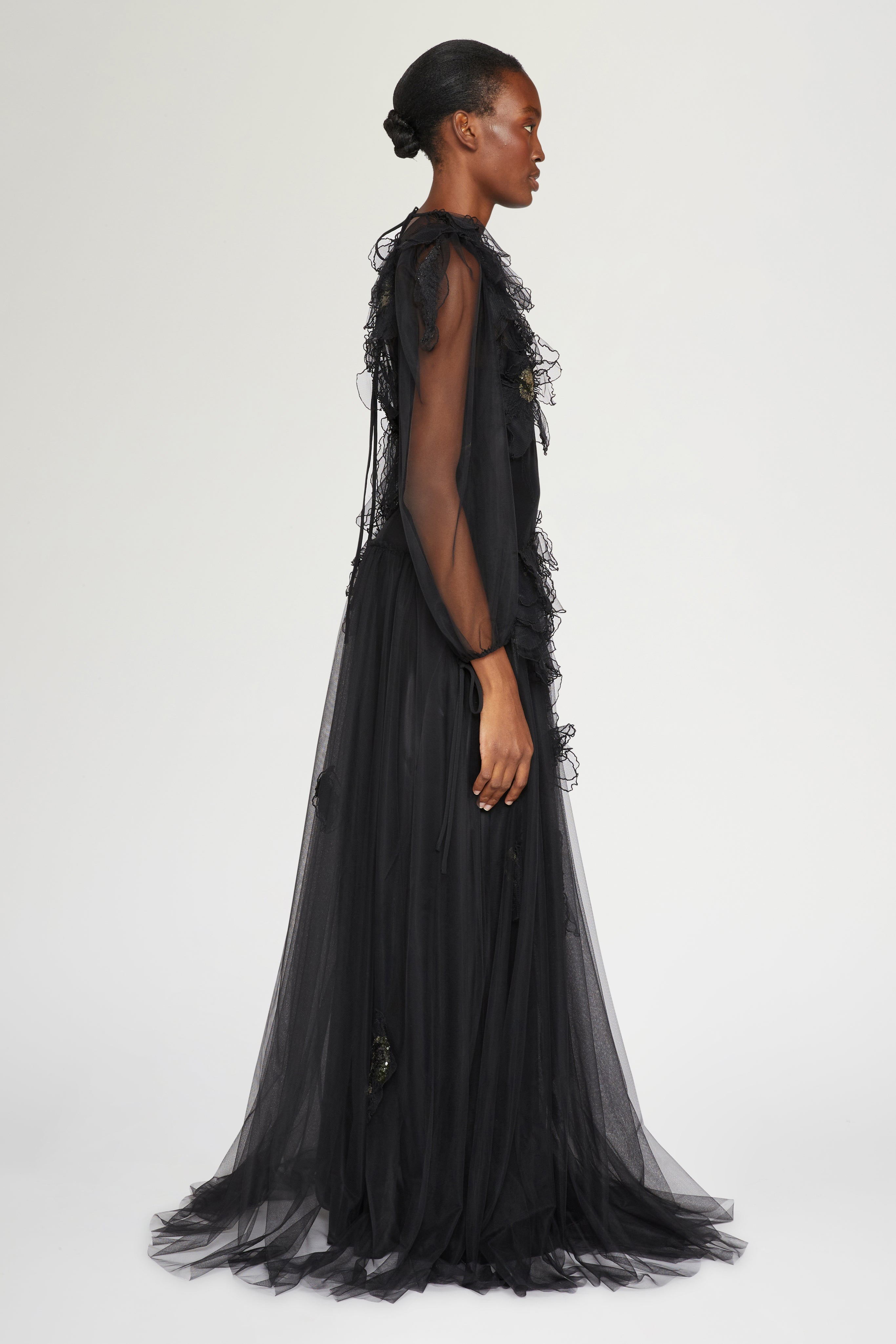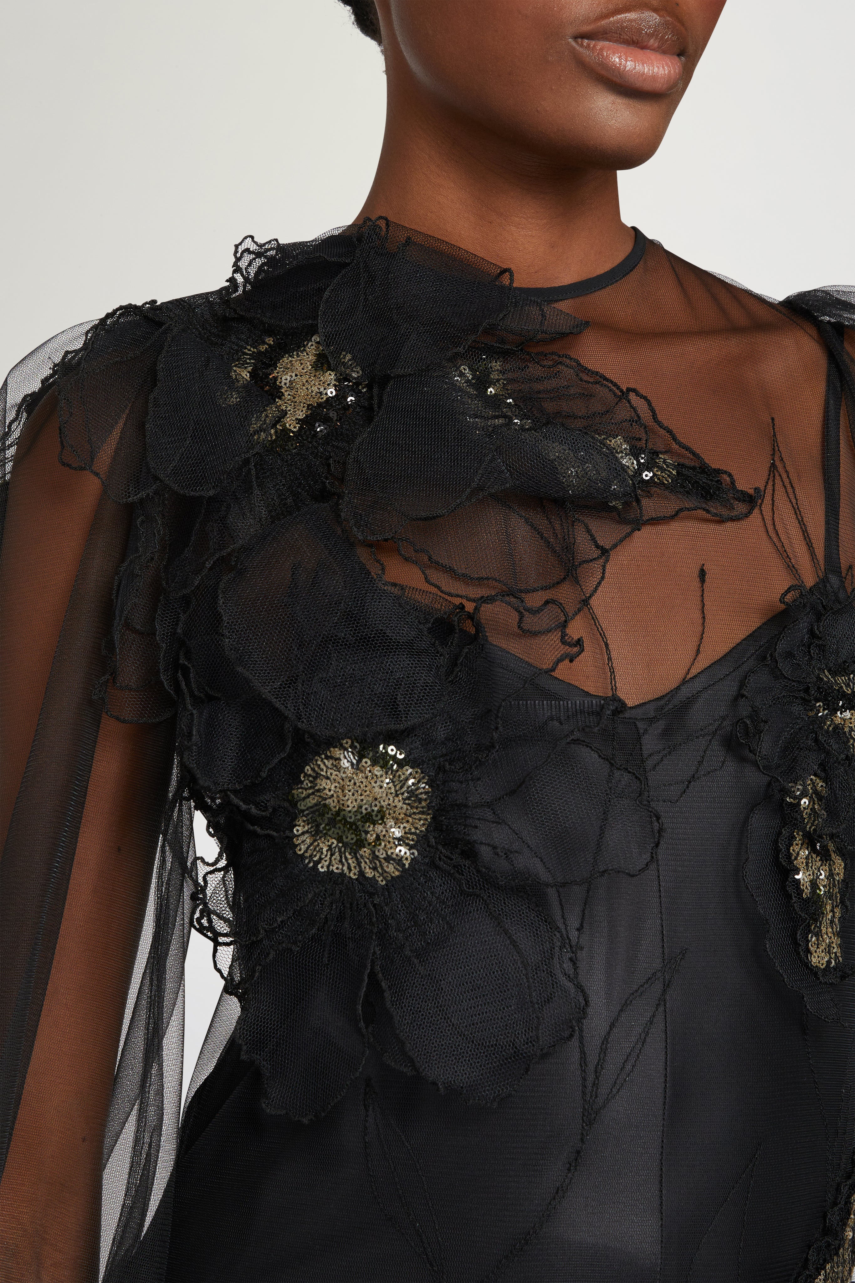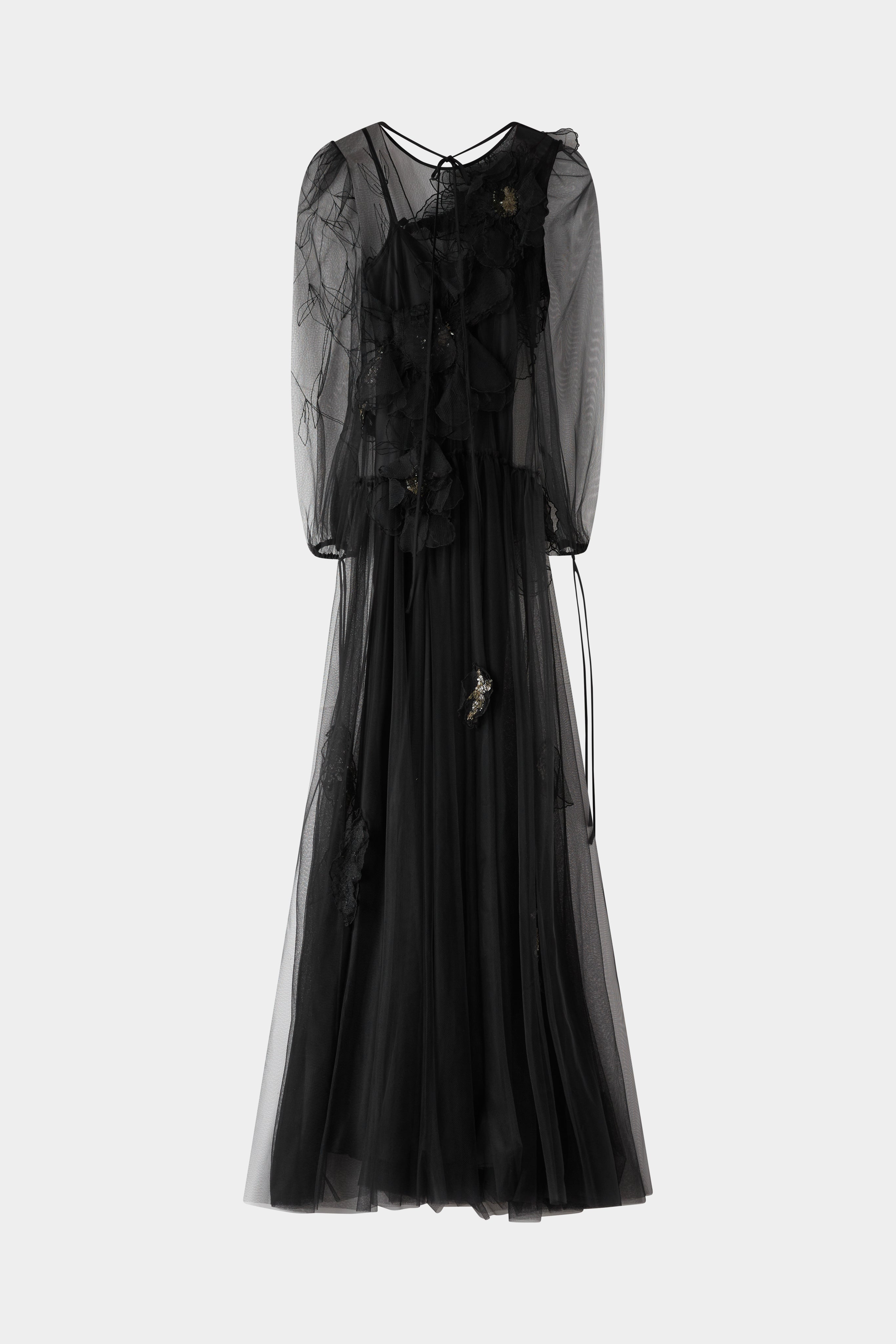 Elegant black evening gown with sheer tulle sleeves, 3D floral appliqués and a flowing silhouette.