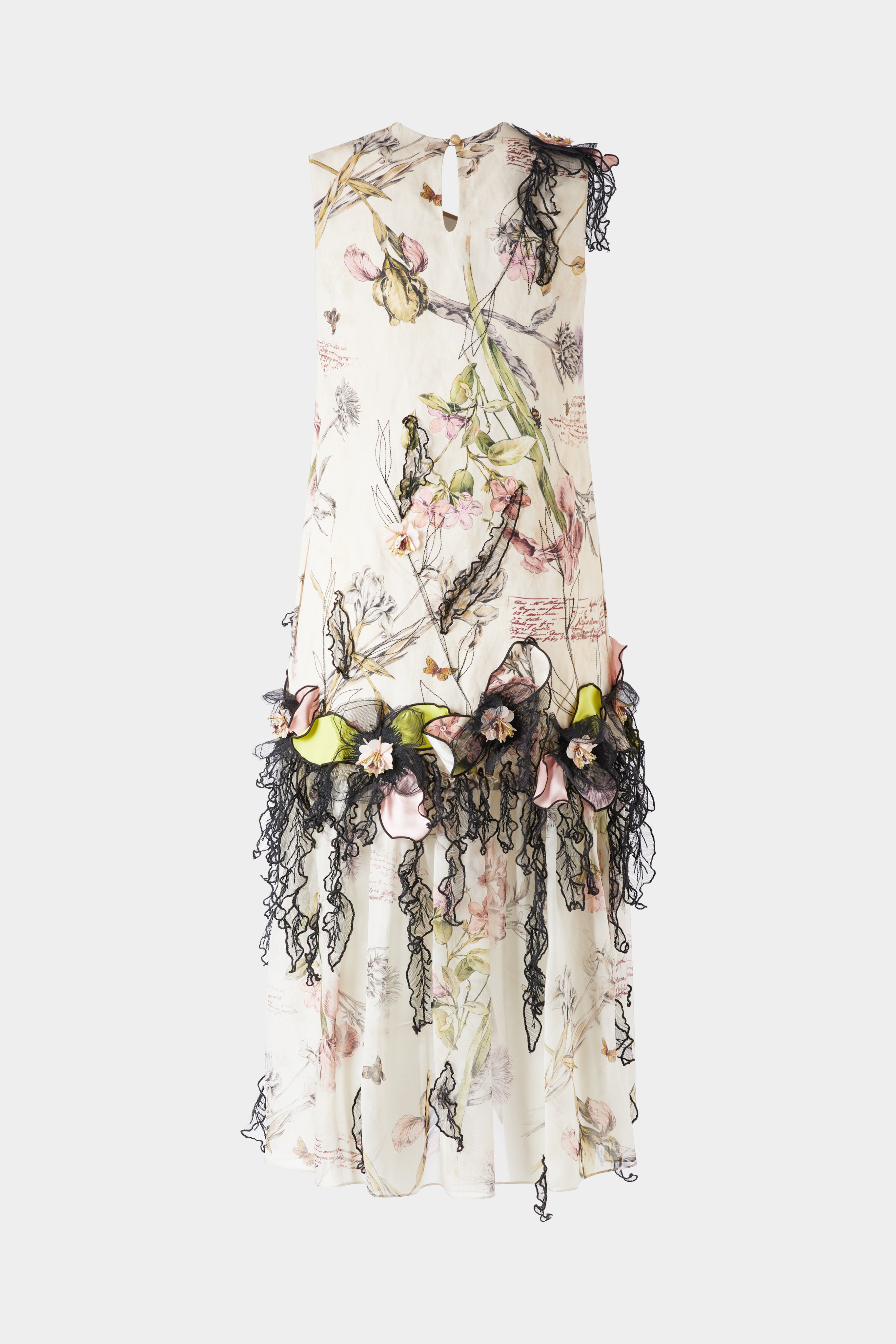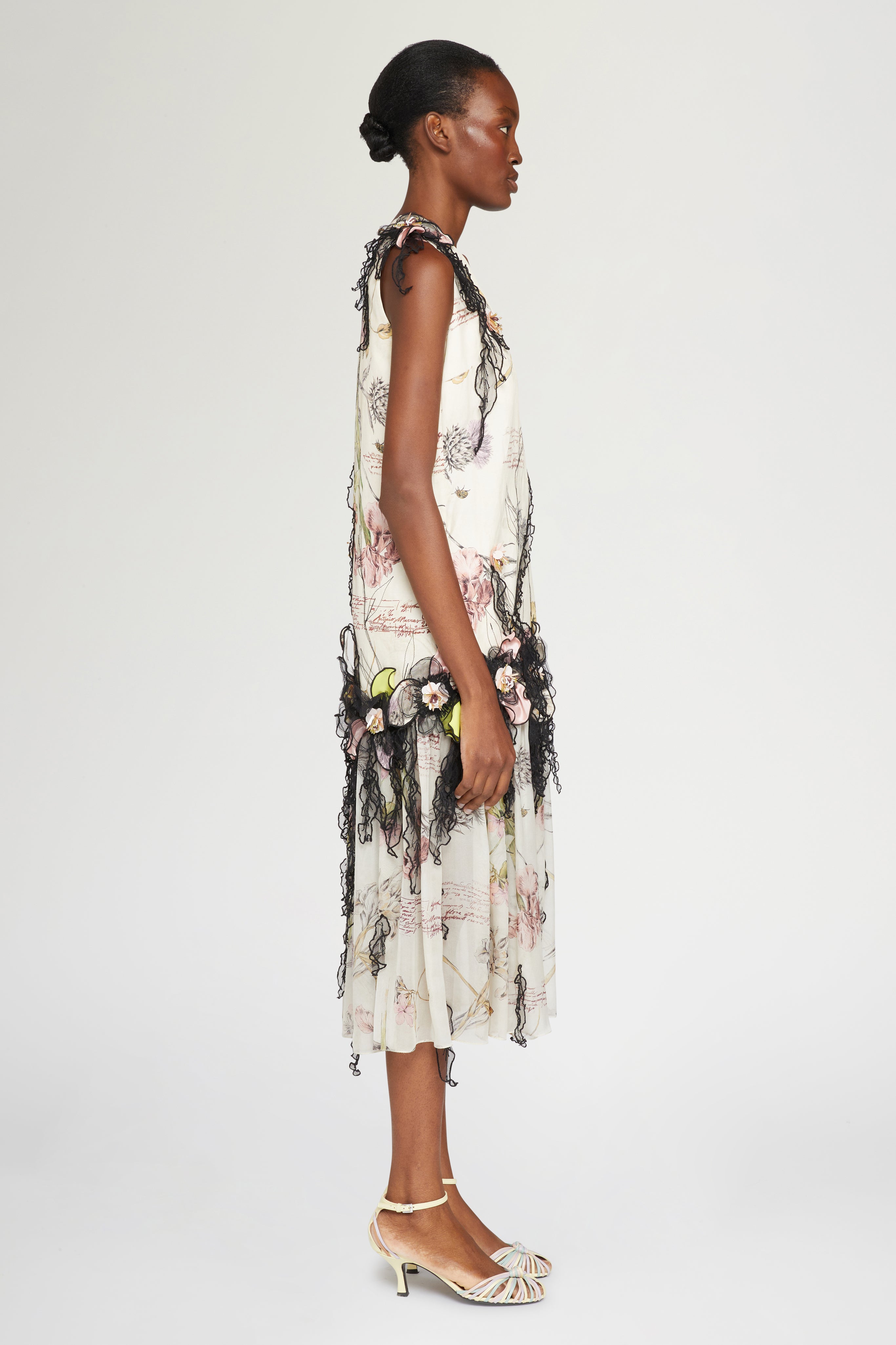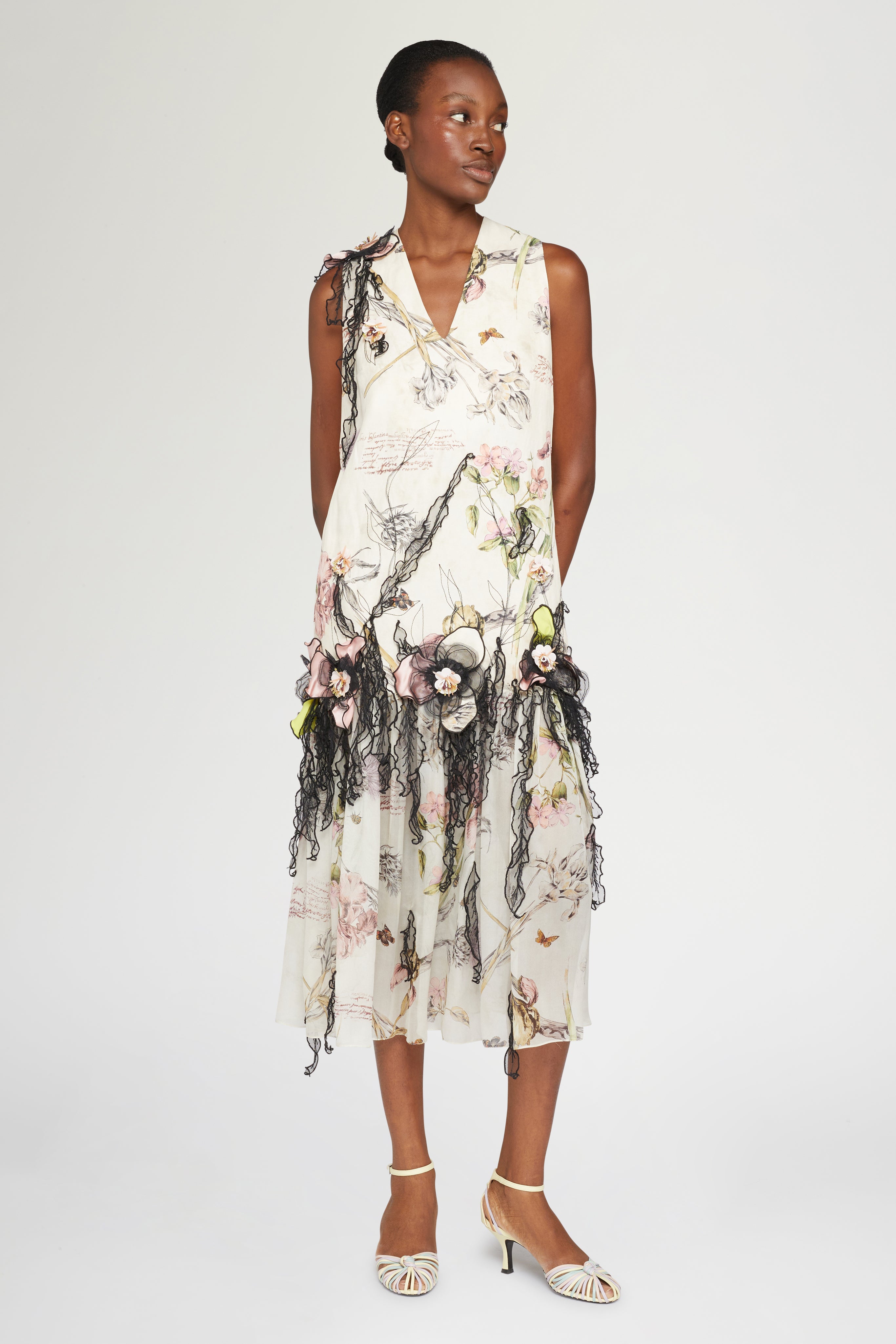 • Midi dress with delicate floral print, featuring black lace accents and 3D floral embellishments.