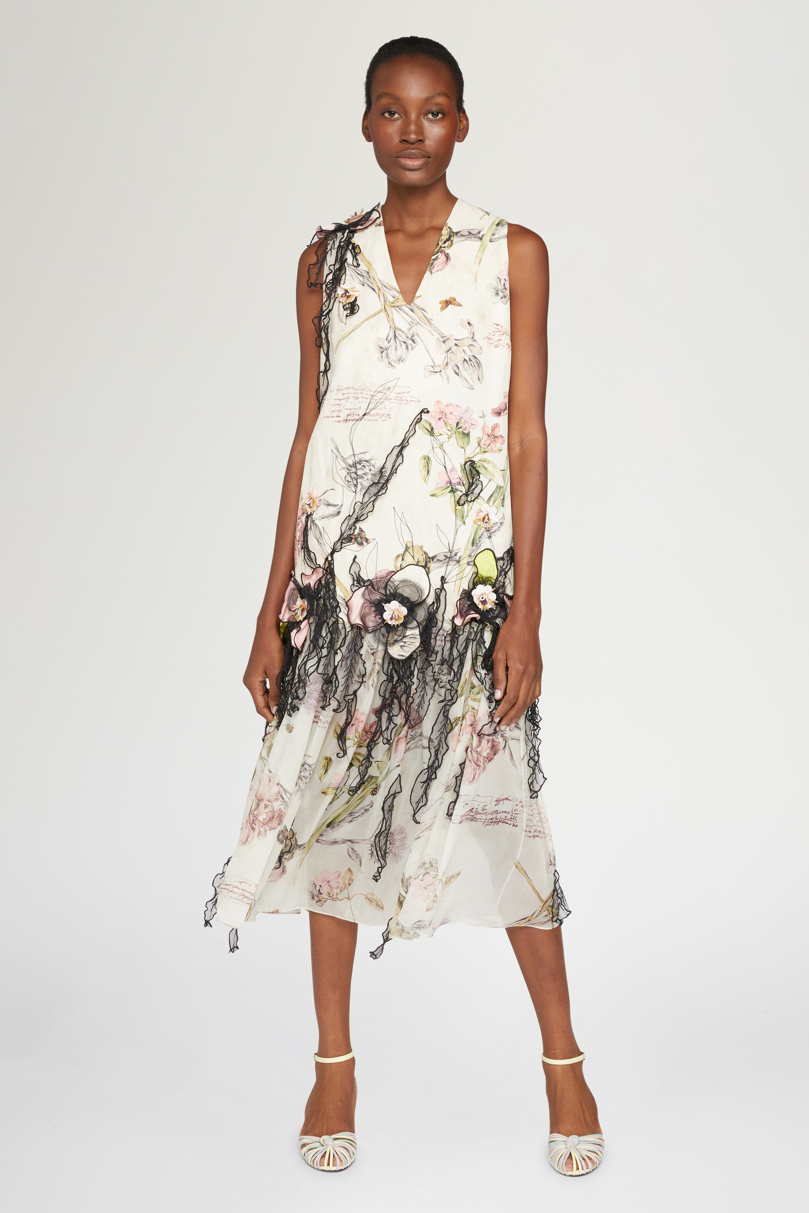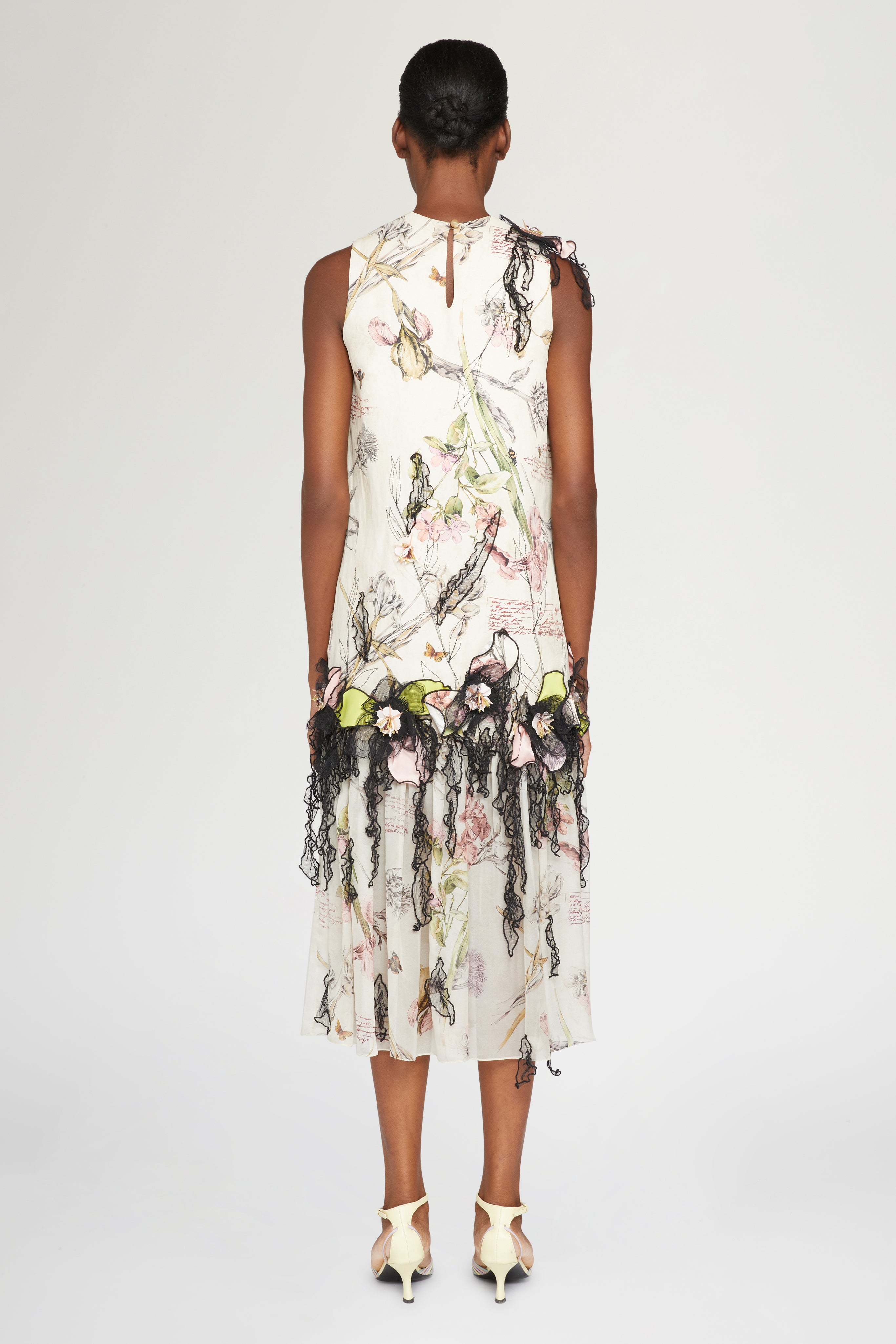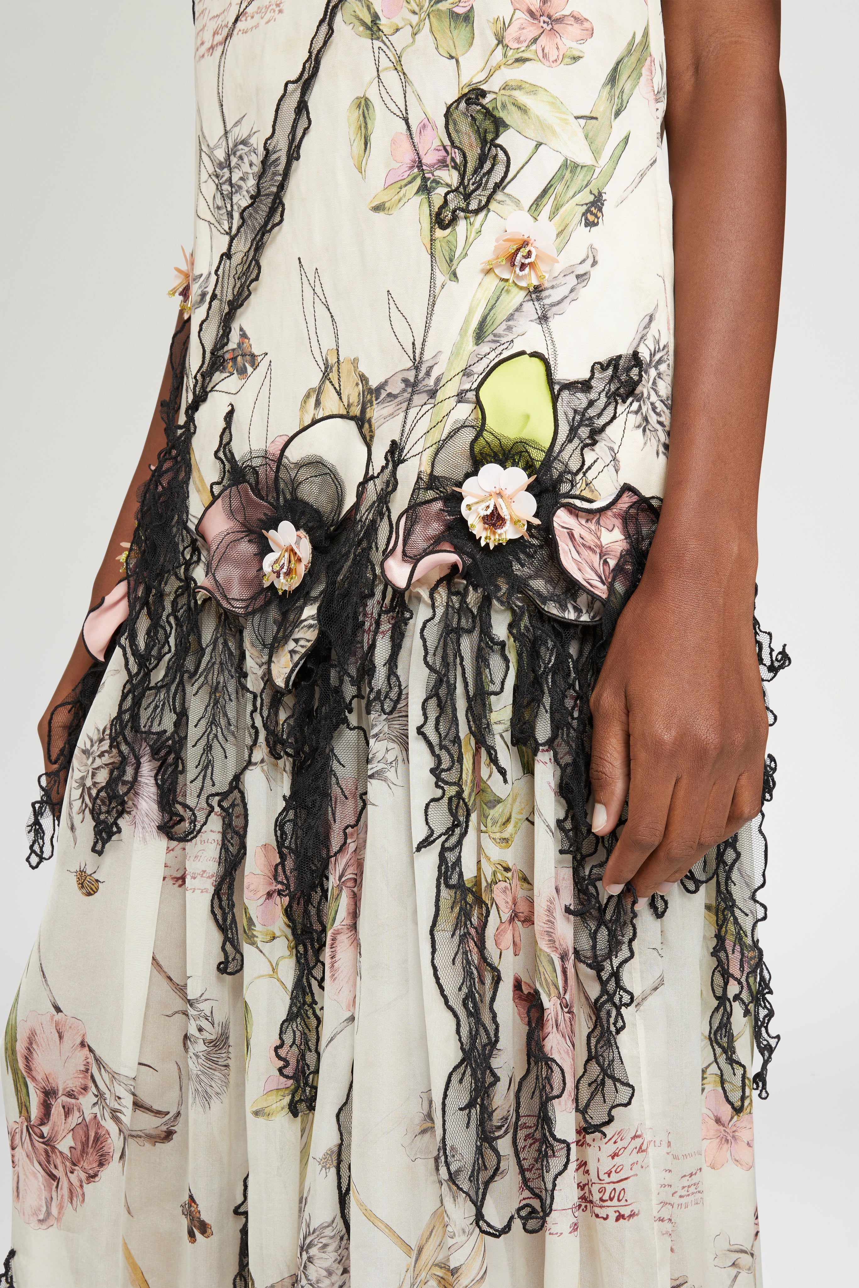 • Midi dress with delicate floral print, featuring black lace accents and 3D floral embellishments.