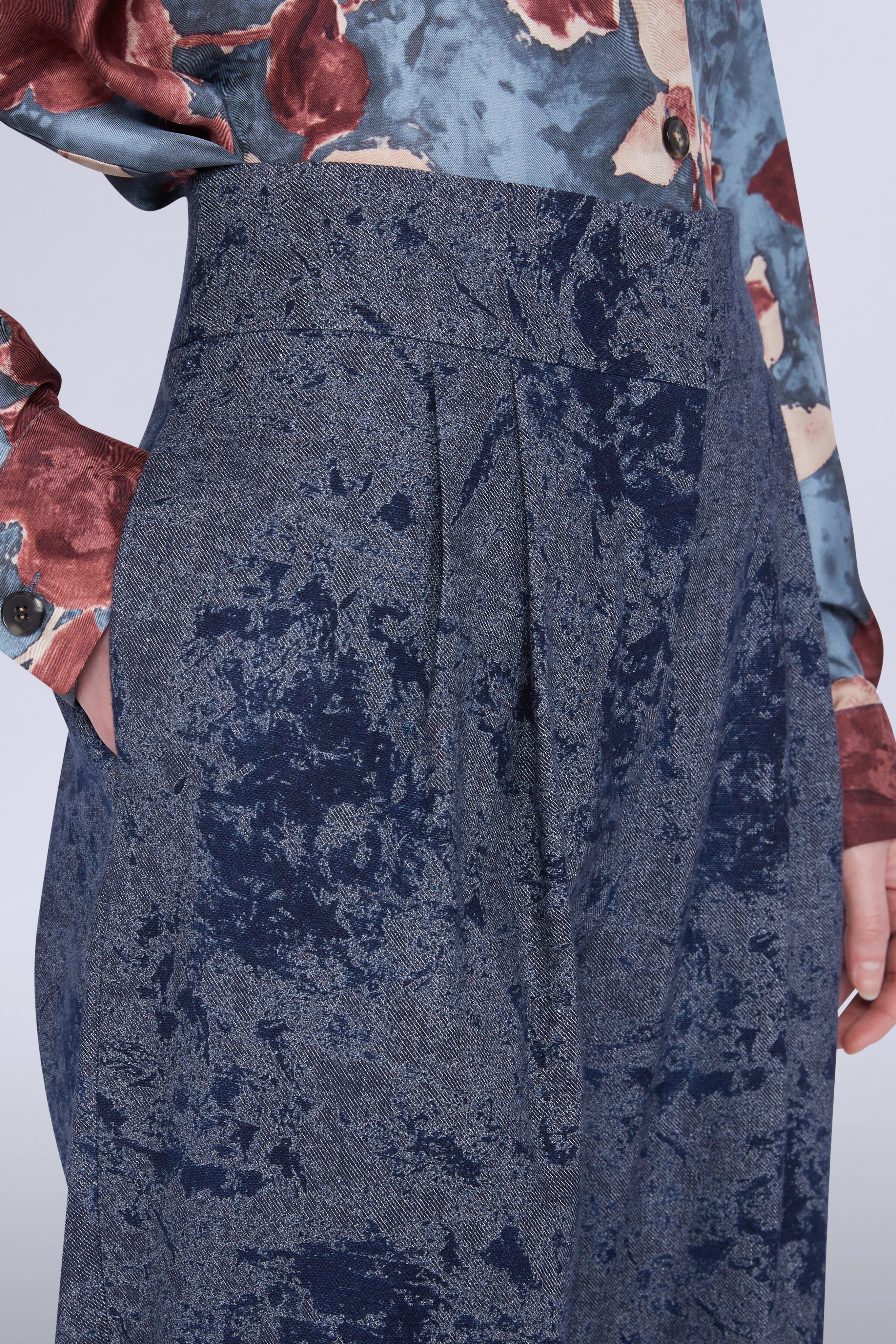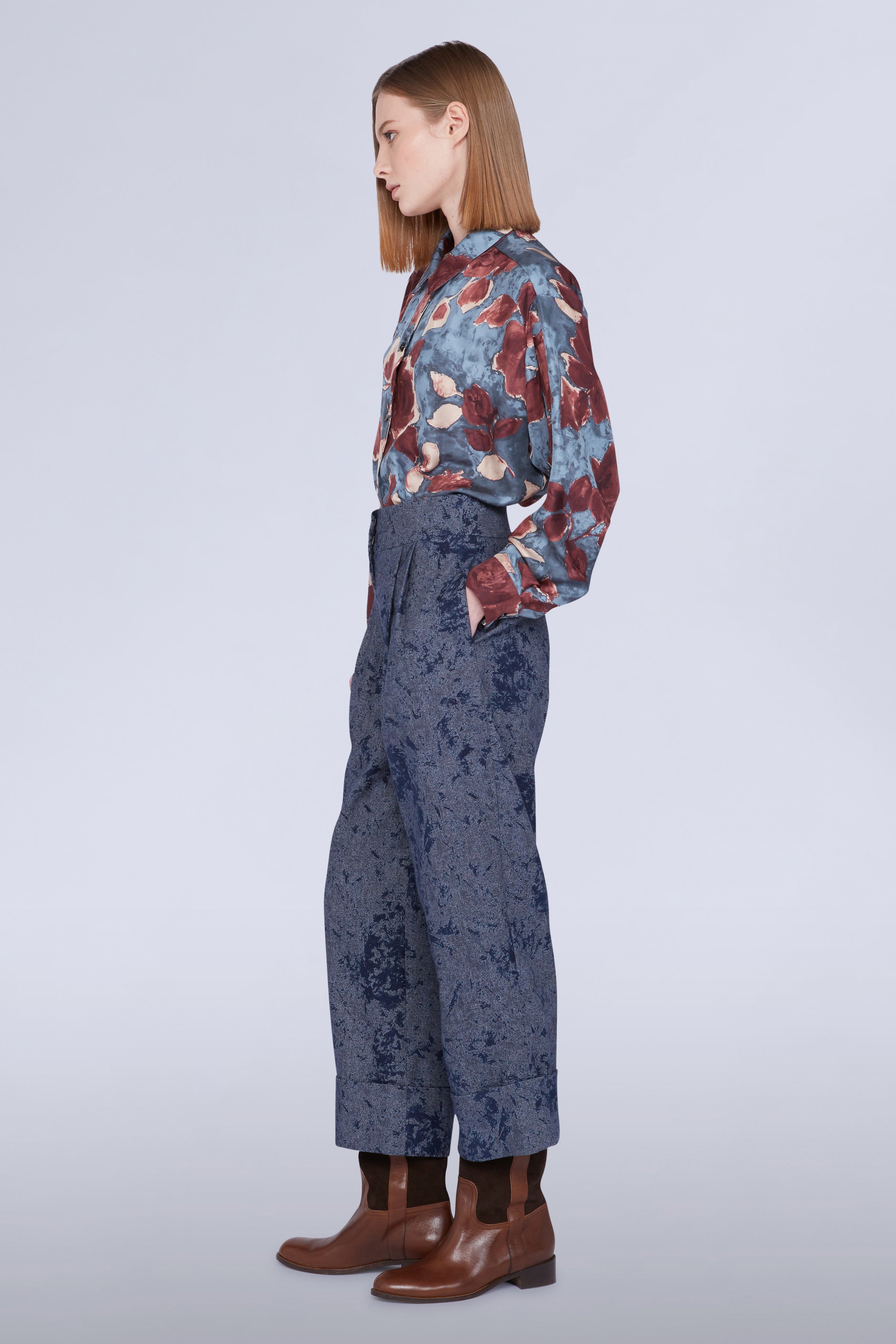 • Blue pants with straight silhouette and deep cuff.