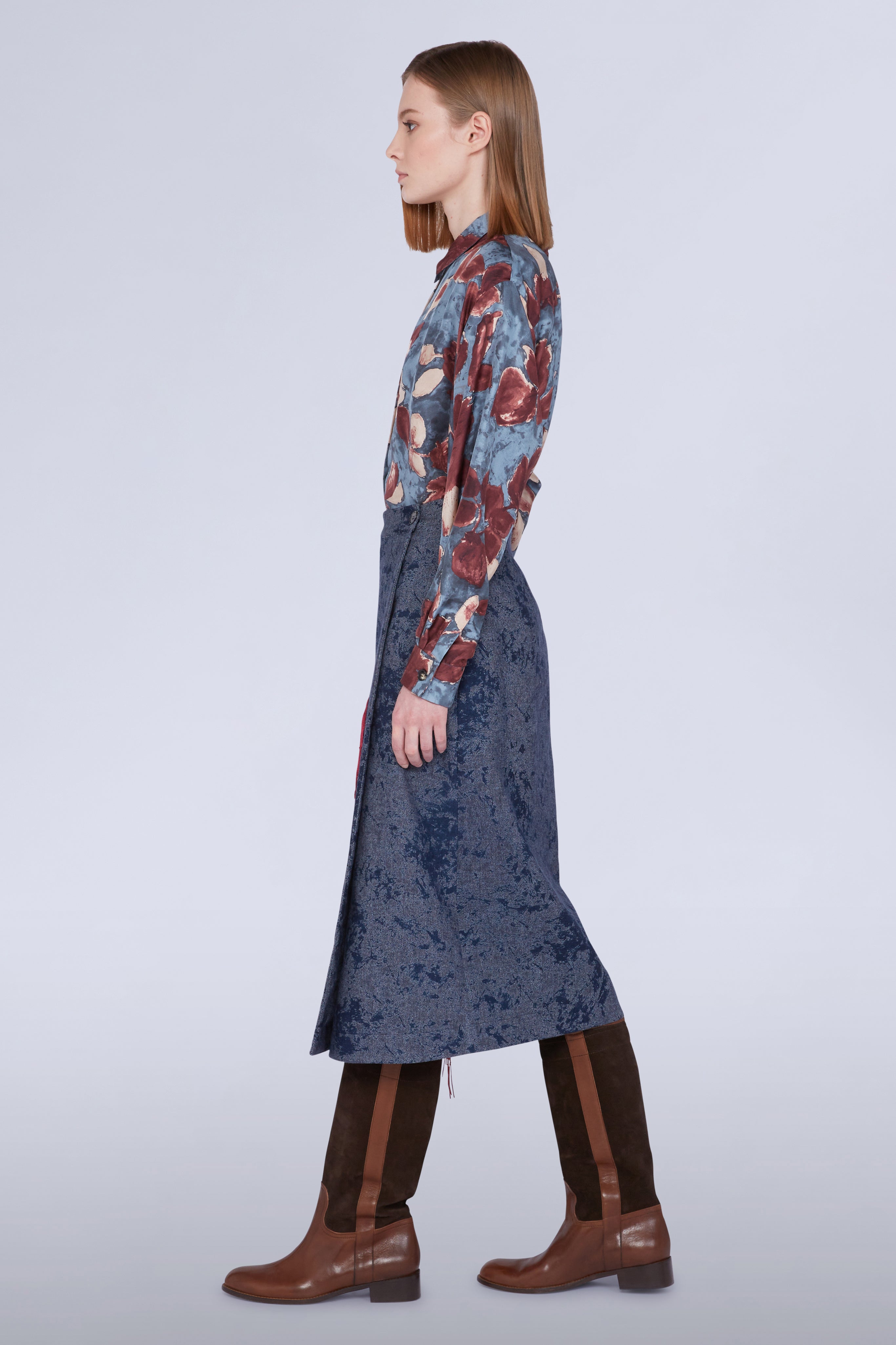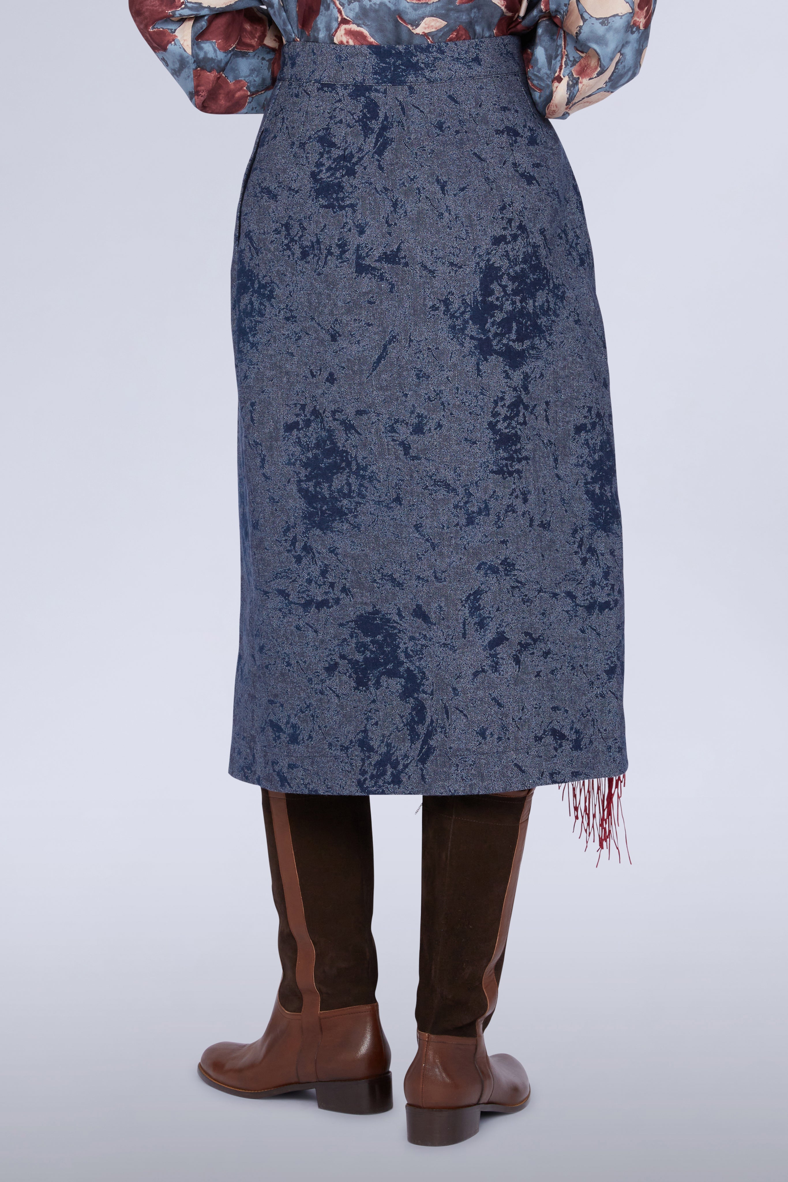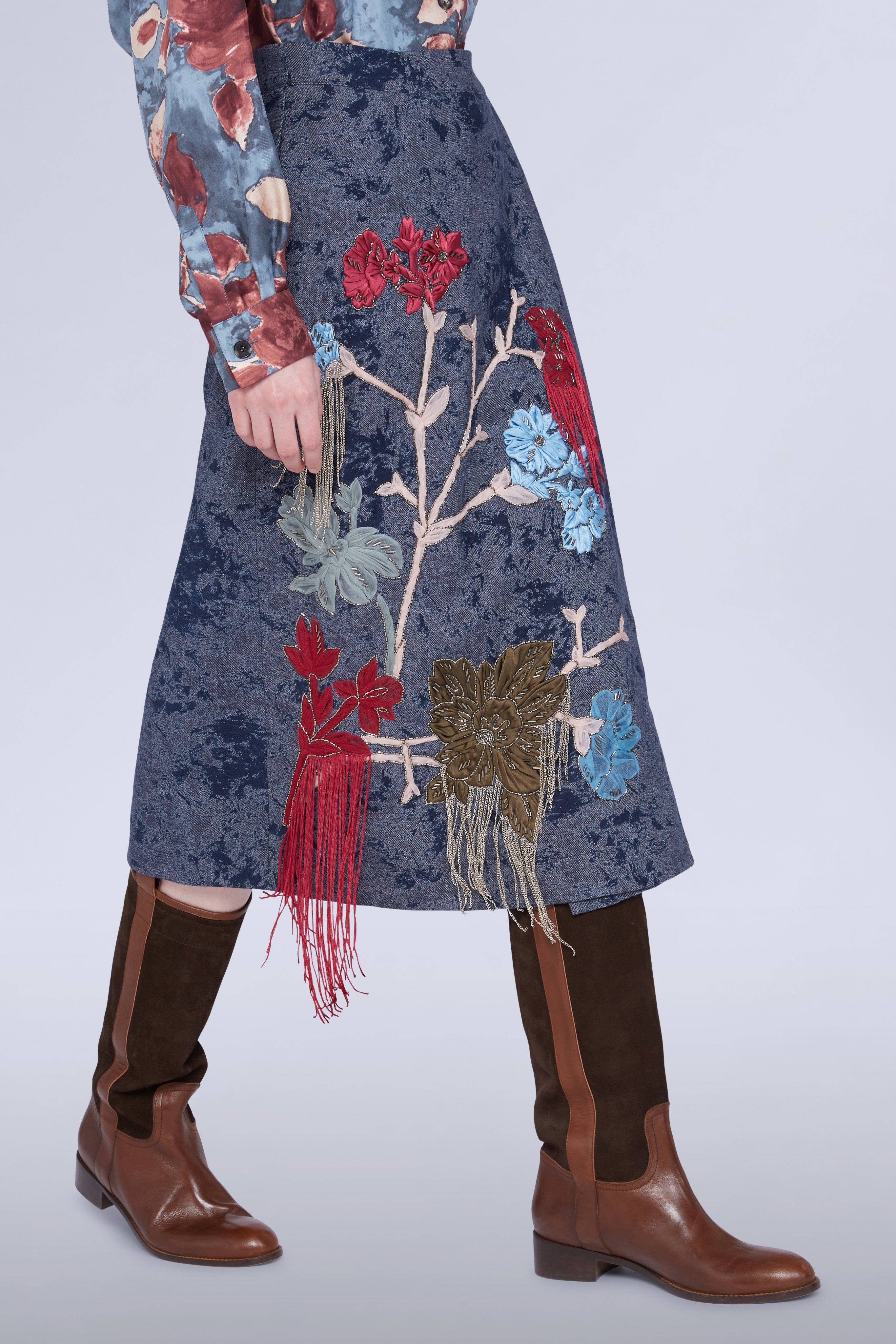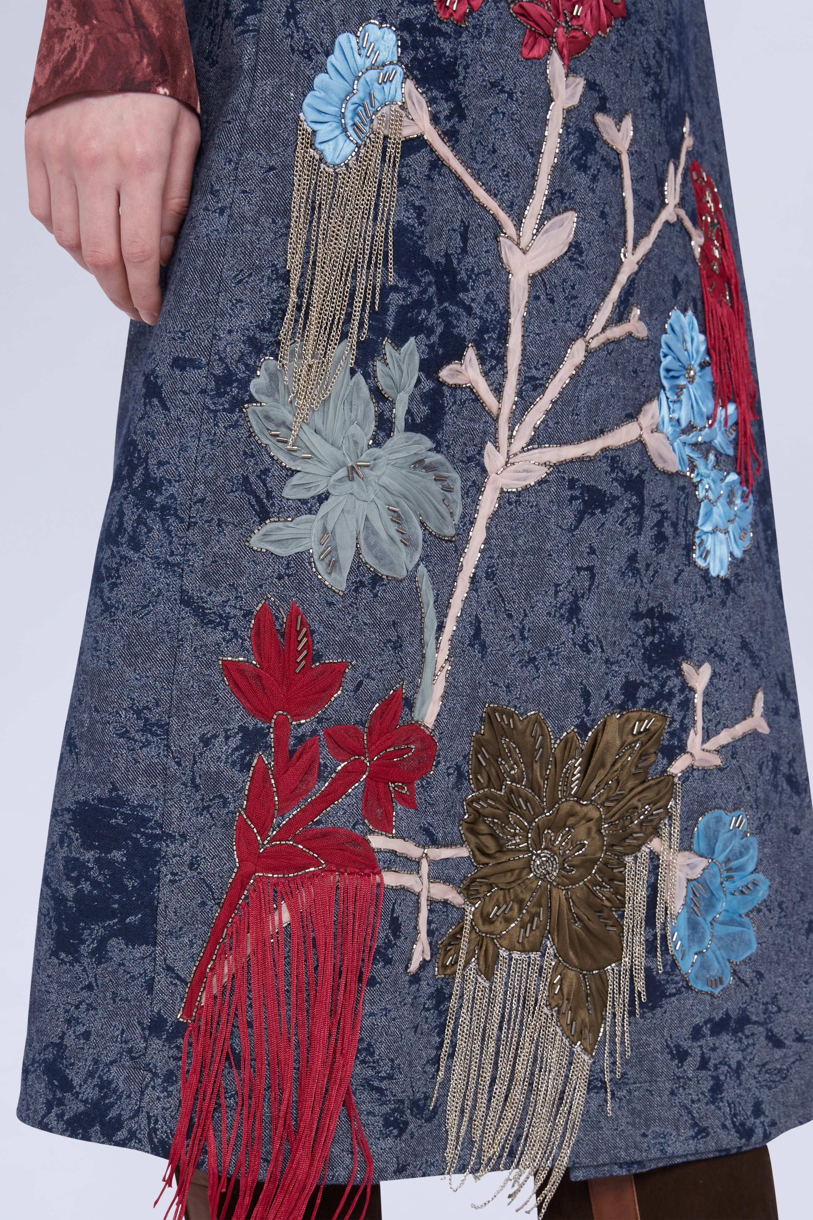 • Blue midi skirt featuring vibrant floral embroidery with fringe details for a statement look.