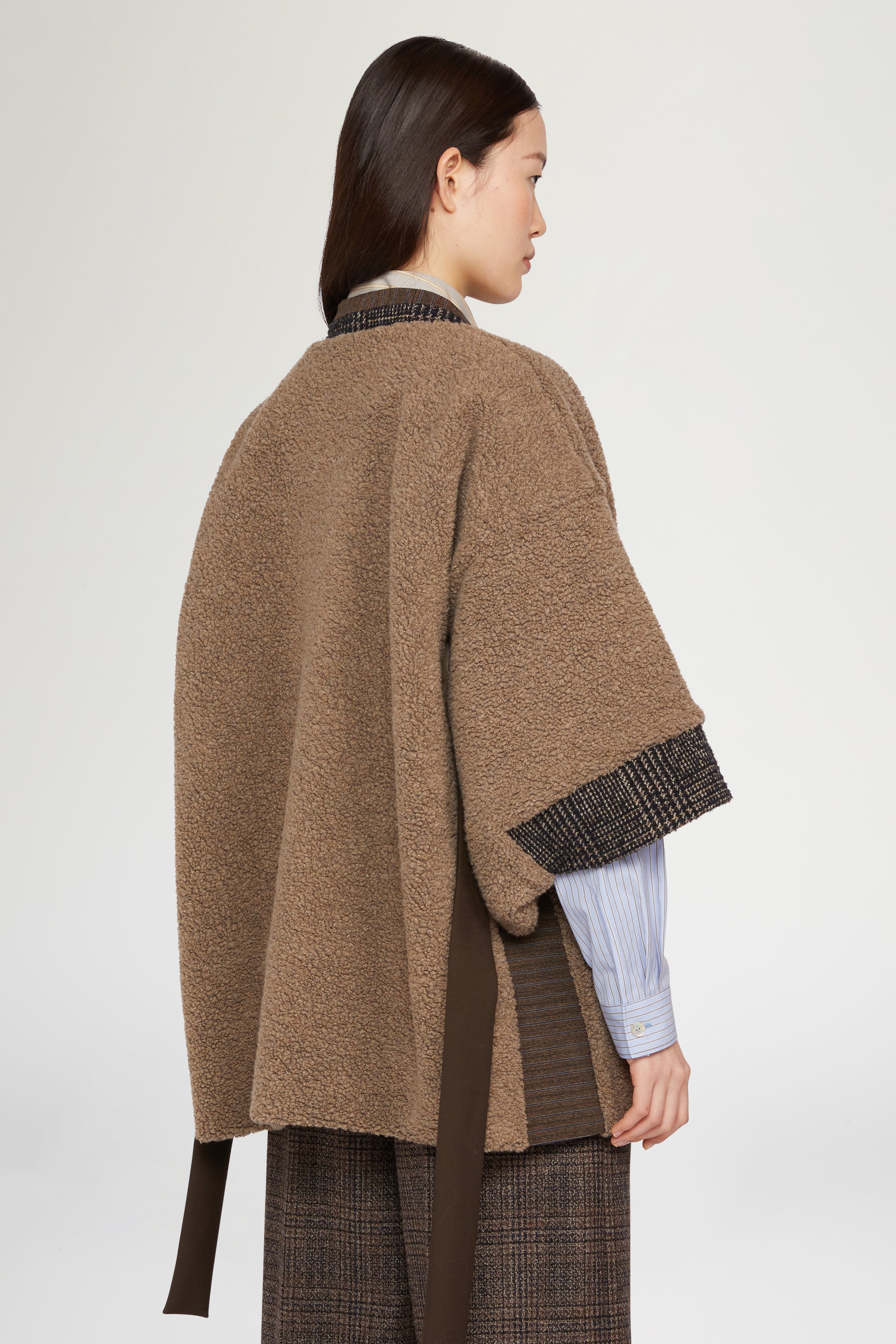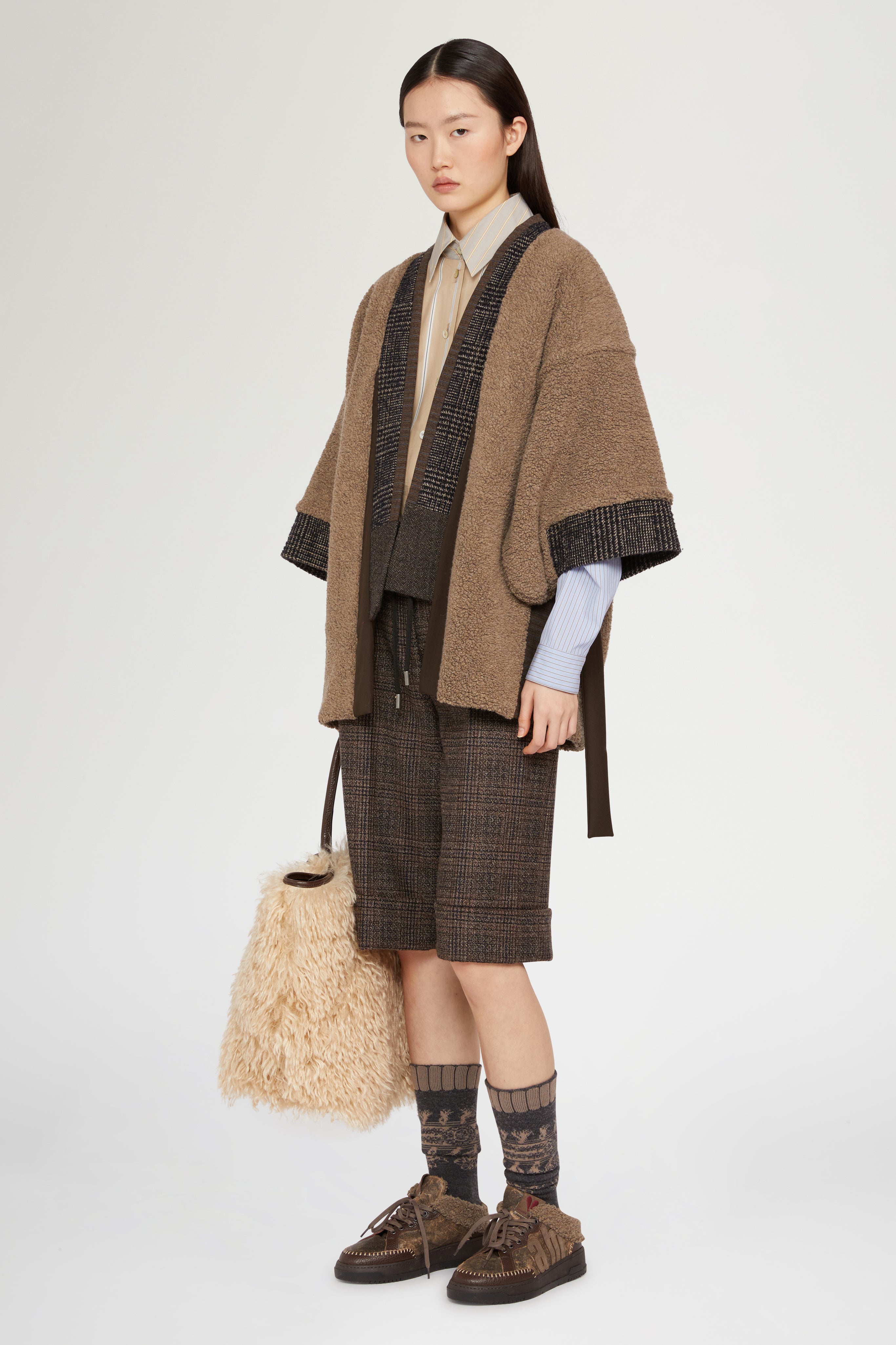 • This women's kimono features a soft wool and cashmere blend, enhanced by checked trims and quilted lining. The relaxed silhouette and belt closure offer comfort and versatility. A tactile layering piece with refined contrast.
