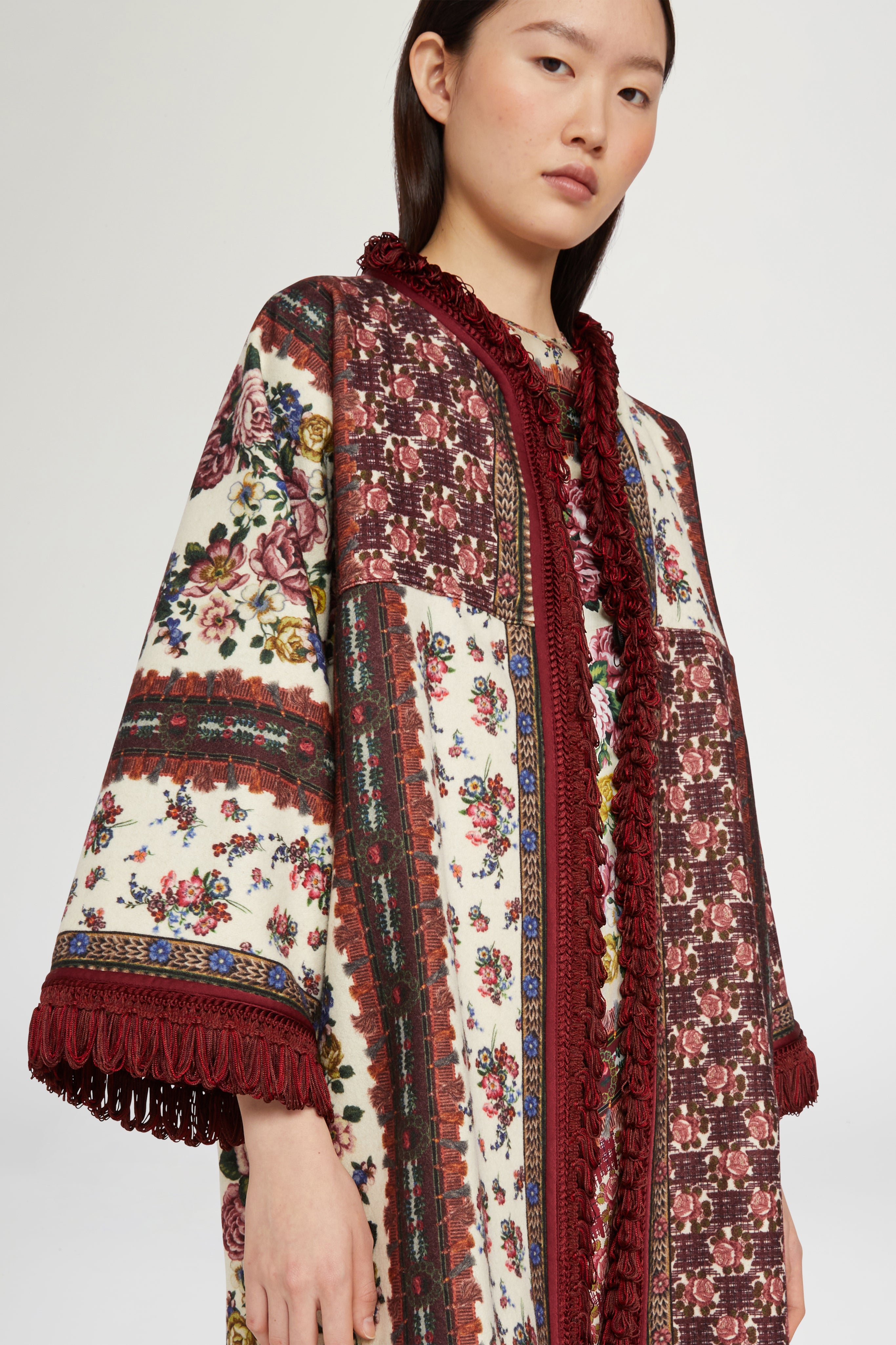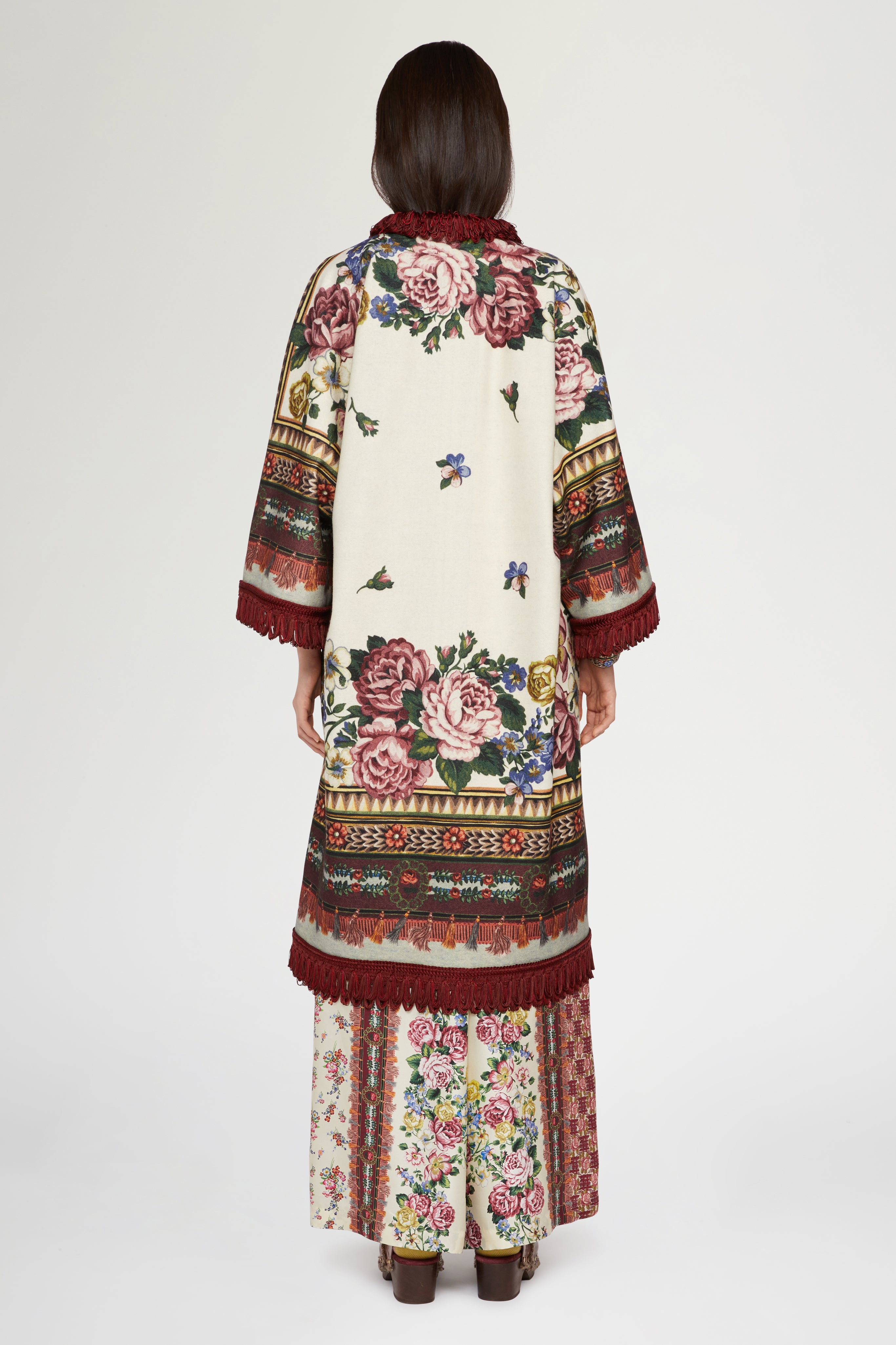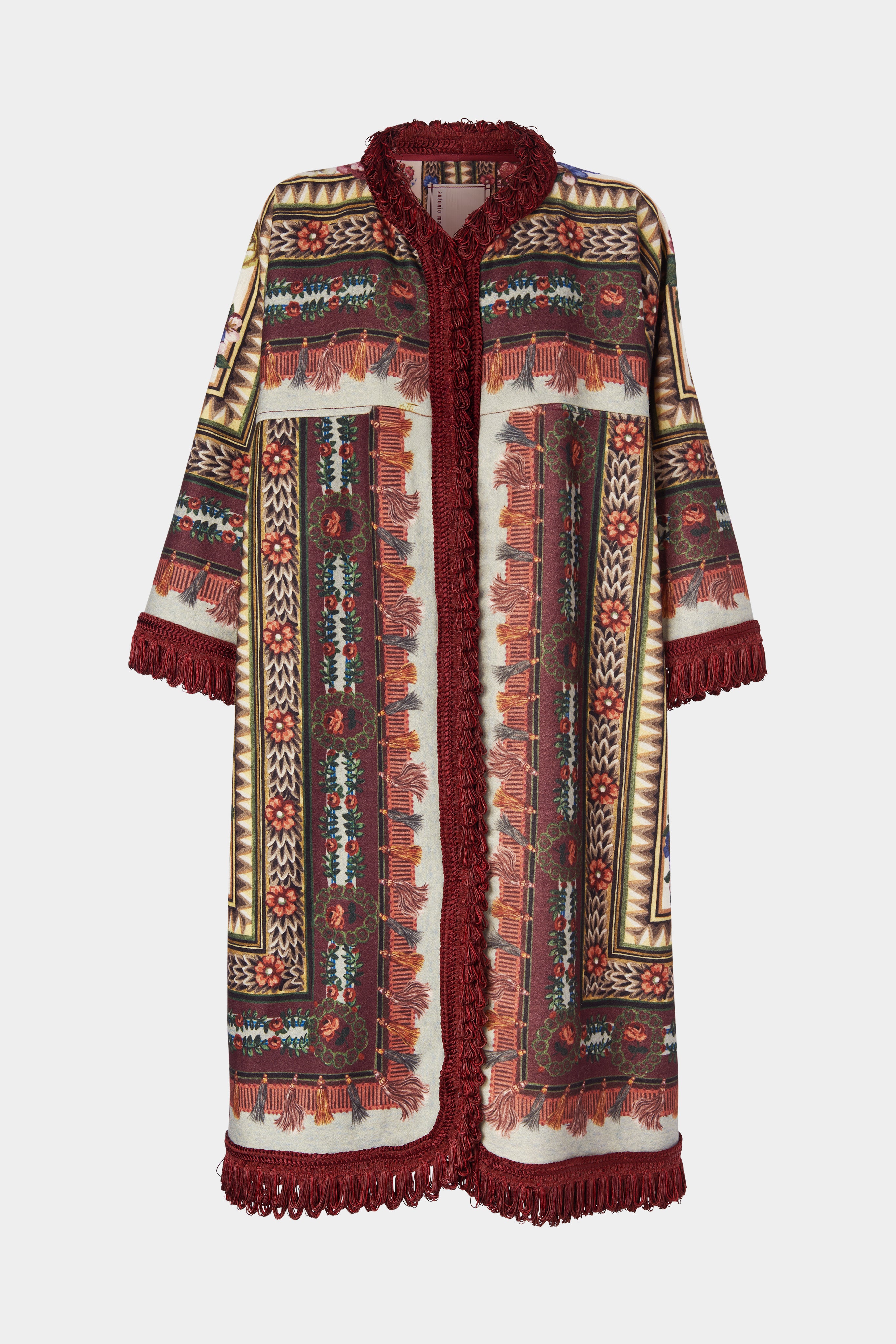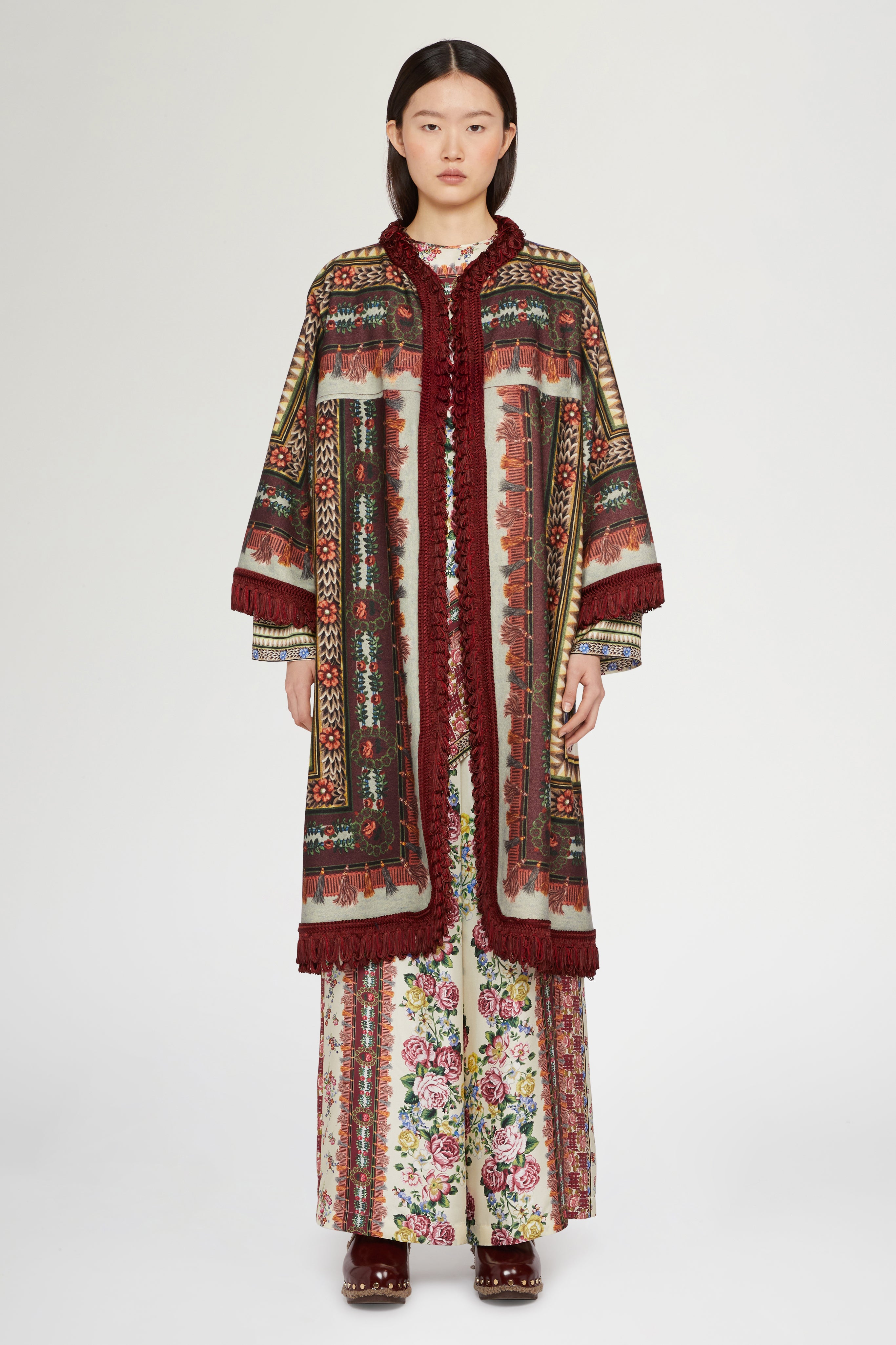 This long wool coat features a rich floral and geometric patchwork print with decorative fringe trims. Crafted from an 80% wool blend, it offers warmth and visual texture. A statement outerwear piece with folkloric inspiration and artisanal flair.