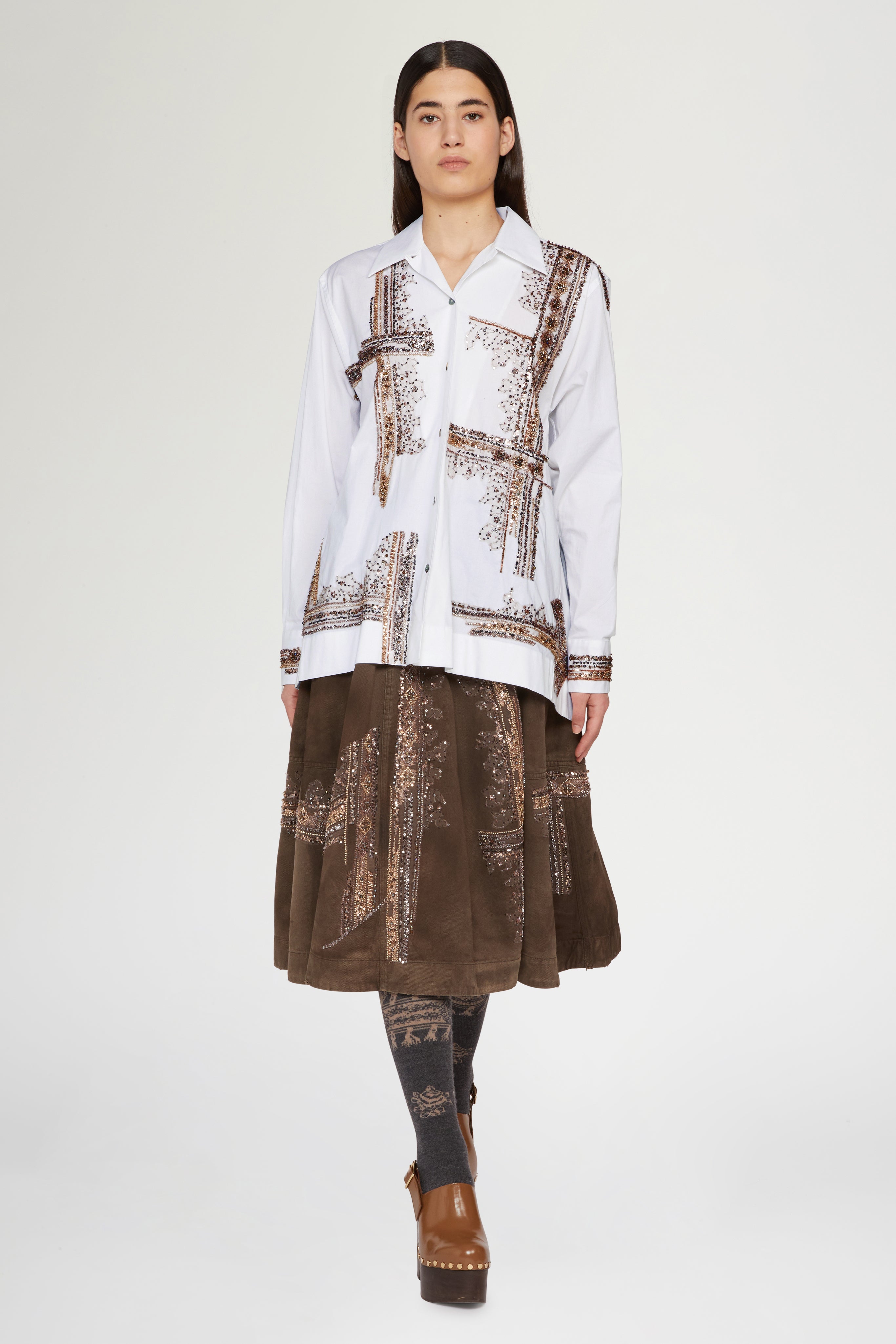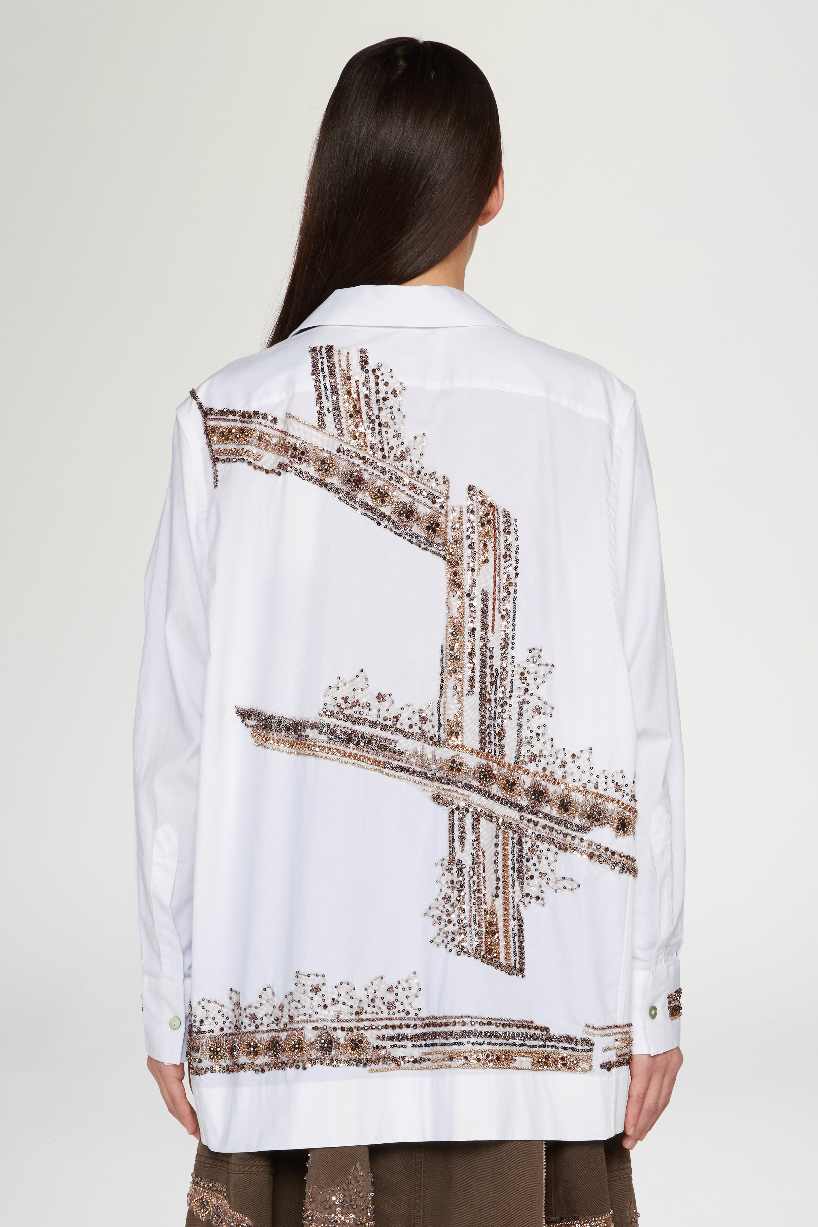 This elegant white shirt in 100% cotton features intricate sequin and lace-effect motifs. A refined statement piece with a relaxed silhouette and artisanal detail.
